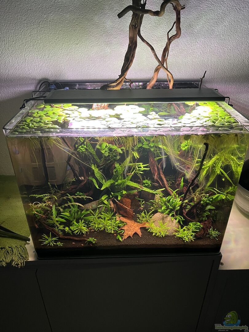 Weissglas-Becken von Dennerle (Nano Tank 70l) wird ohne GlasAbdeckung betrieben, das Holz-Hardscape (Wurzel) von Amtra Dragon Skin steht oben einige cm heraus. Als Schattenspender dient eine Schwimmpflanzendecke Schwarze selbstklebende Rückwandfolie Die Einrichtung selbst wurde nicht mit Fotos begleitet, da mein erstes Becken