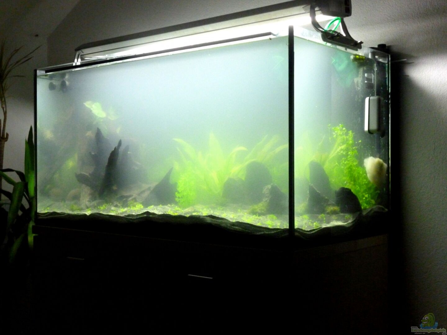 "Alpen meets Amazonas" ist ein Neustart meines Beckens "American Dream", welches von Dez. 2011 bis Jan. 2013 wegen Umzugs leer stand. Die darin gehaltenen Fische werden dem alten Bestand recht ähnlich werden, das Pflanzendesign soll jedoch "modernisiert" werden. ~ Der Unterschrank (Vollholz) ist eine Ma??anfertigung vom Tischler passend zur Wohnzimmermöblierung.