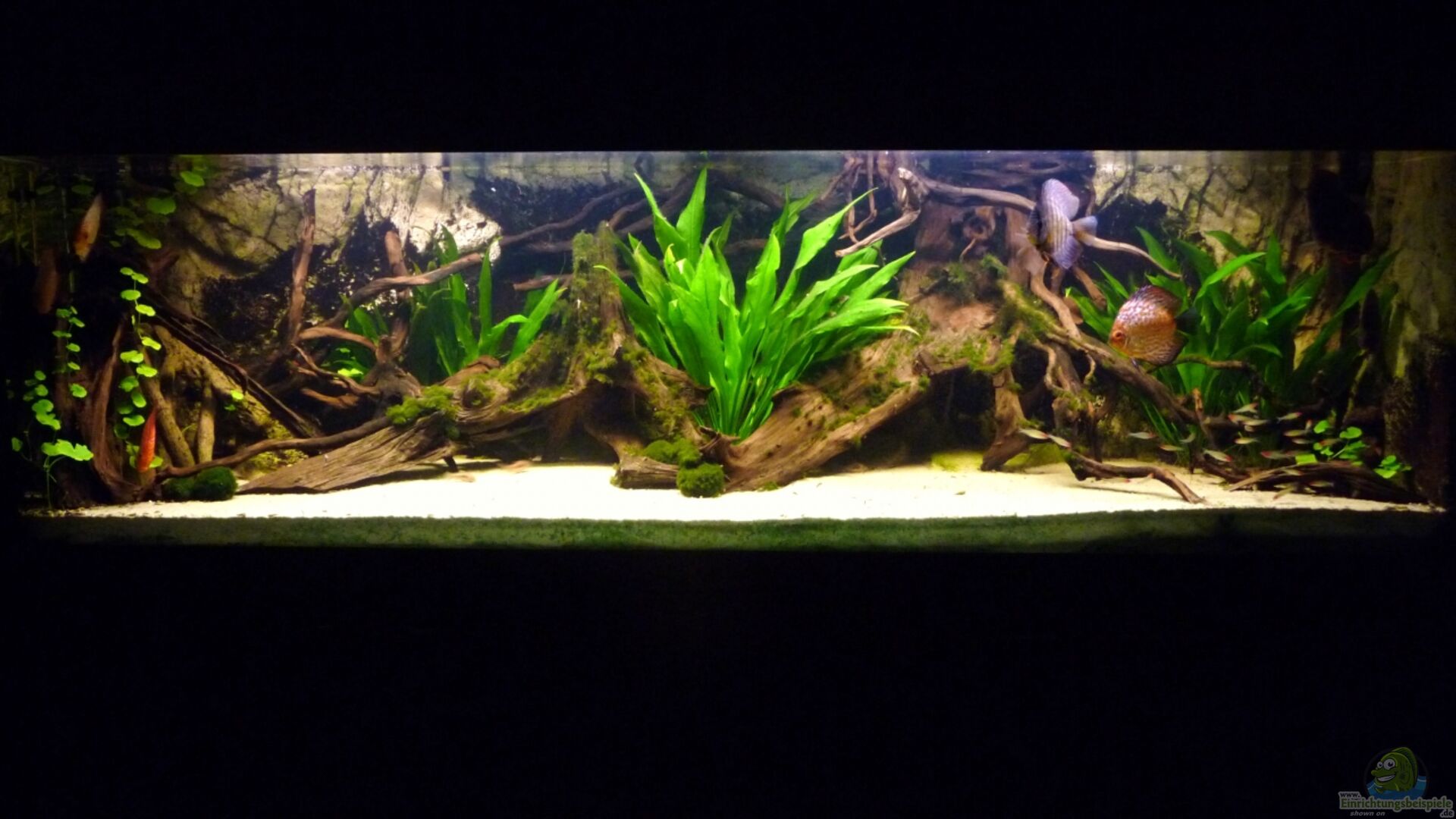Standardbecken, sto??verklebt. Unterschrank und Abdeckung in Bucheoptik. Die Bodenscheibe ist von innen zum Schutz mit 1 cm Styropor beklebt (das Aquarium war früher mal ein Tanganjikabecken mit vielen Steinaufbauten). Auch das Becken selbst steht auf einer 1 cm Styropor-Schicht. Um die Standfläche der ganzen Kombination etwas zu vergrö??ern, steht der Unterschrank auf einer Arbeitsplatte. Damit soll die Last ein wenig gleichmä??iger auf dem Fu??boden verteilt werden.