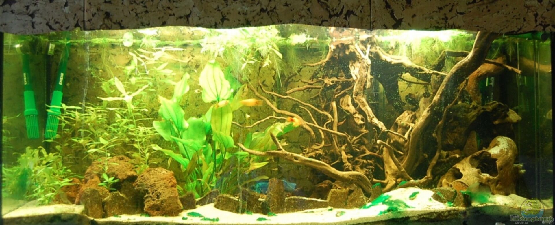 Ganz normales Juwel Aquarium. Bodenbohrungen wurden verklebt Becken steht auf Juwel Unterschrank in Buche. Beleuchtung ist Eigenbau und wurde vom Vorbesitzer so übernommen. HMF ist mittlerweile raus Ende Mai 2010