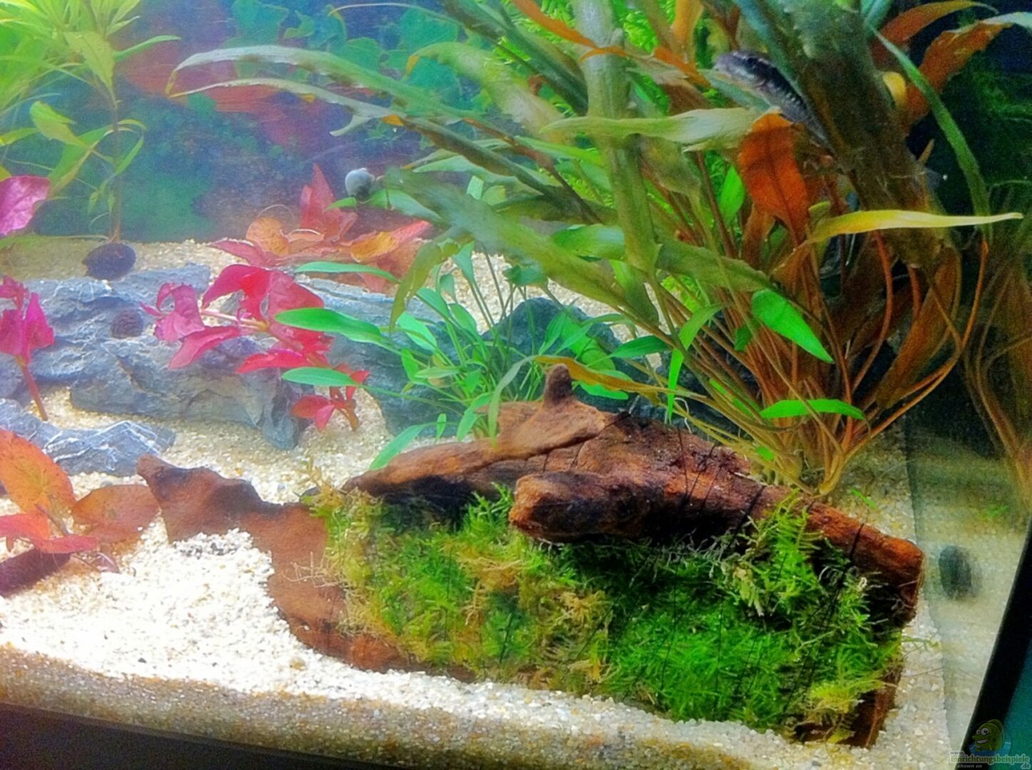 Mini Landschaftsteine als Höhlenversteck für die Dornaugen eine gro??e Moorwoodwurzel mit Javamoos 3D-Rückwand 80x40 dünn von EKOL Jerzy Szmaj Seemandelbaumrinde als "Holzhaufenversteck" angelegt Seemandelbaumblätter Erlenzäpfchen