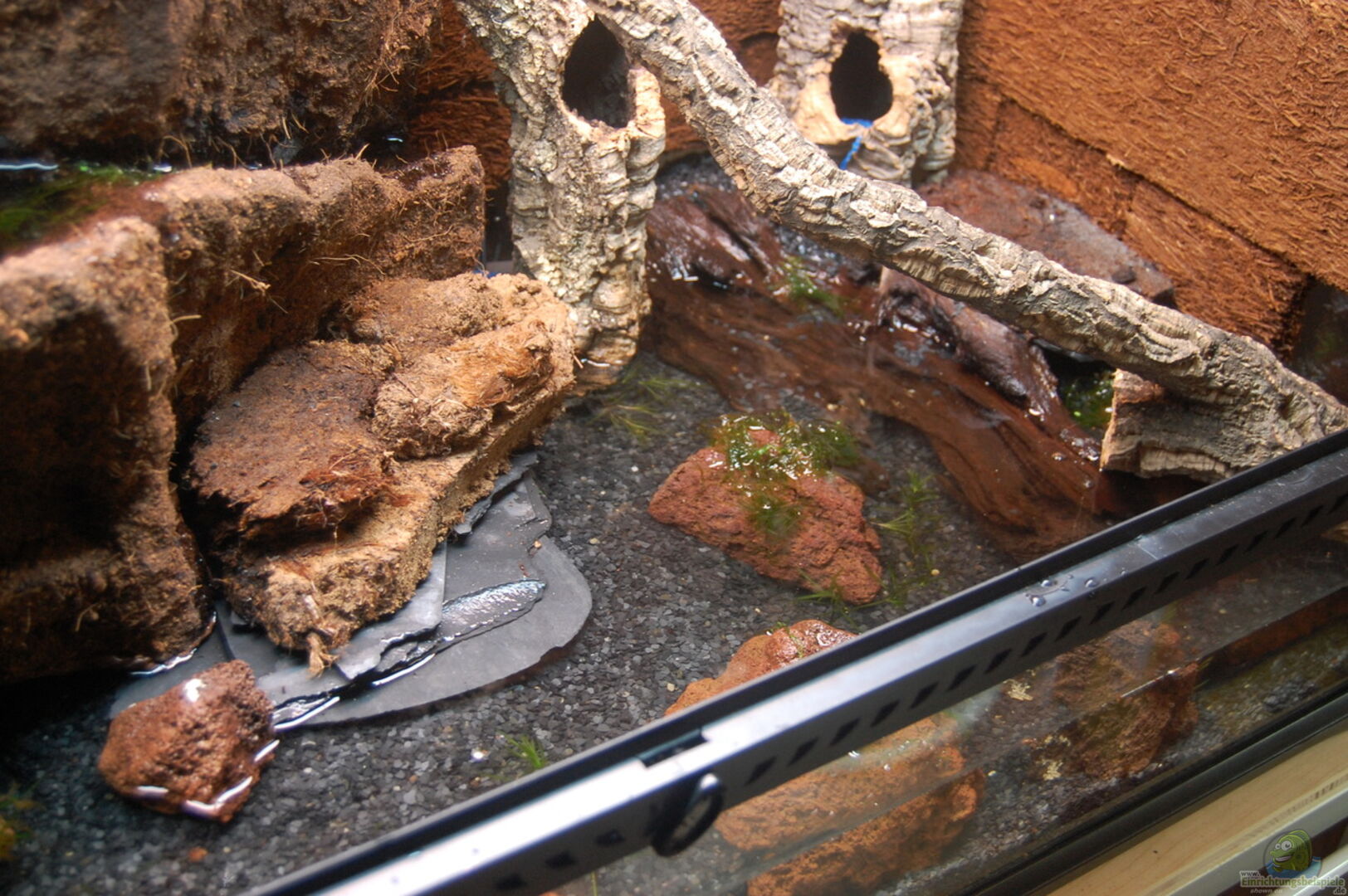 Rückwand besteht aus 1-2 cm dicken Xaxim-Platten (Neuseelandfarn), die mit Aquariensilikon festgeklebt wurden. Als weitere Deko-Elemente verwende ich hohle Korkeichenrinde, welche bepflanzt sind, Lava-Gestein und Weisstorfplatten. Die folgenden Bilder zeigen die Veränderung des Terrariums im Laufe der Zeit mit Datumsangabe.