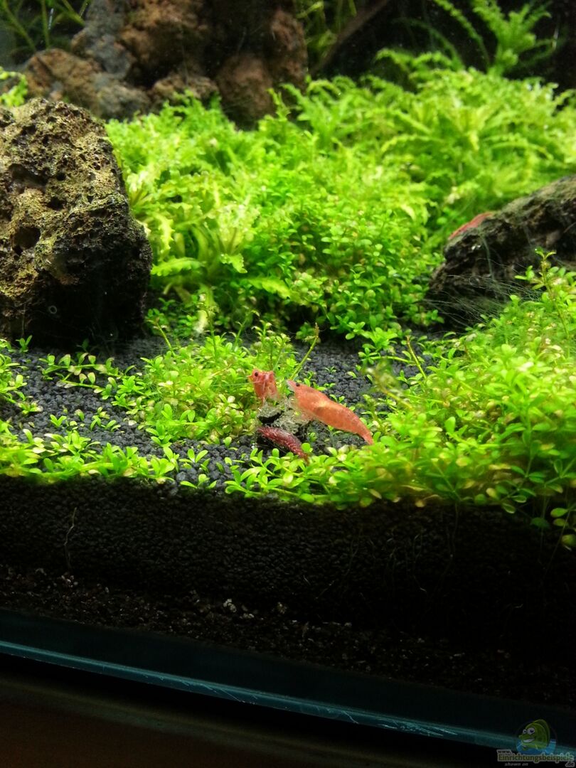 Die Vorrichtung des Hamburgermattenfilter ist mit Schieferstückchen beklebt. Die selbstgebaute Schieferrückwand ist ebenfalls fest eingeklebt. Die Seiten der Rückwand sind nicht komplett geschlossen. So haben die Garnelen die möglichkeit sich dahinter zu verstecken. An dieser Stelle gab es schon interessante Beobachtungen. Mittlerweile sucht hat auch die Wasserpest die Lücken entdeckt und wächst fröhlich dahinter weiter.