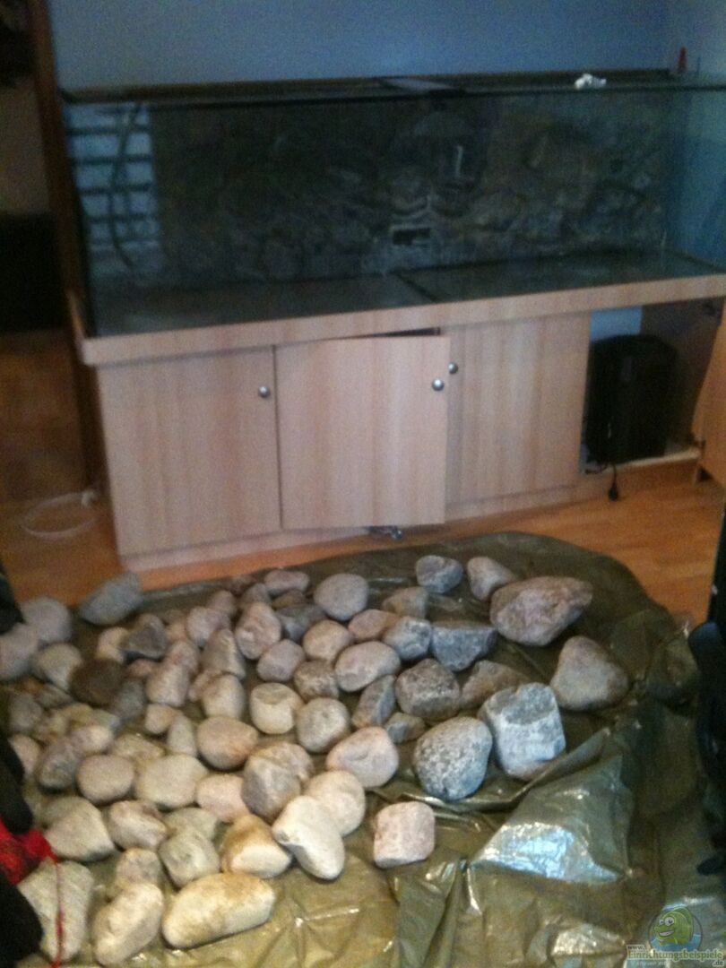 ca. 200 - 250kg gemischtes Gestein, etwa vergleichbar mit Rheingestein, bereits vorhanden. Sollen links und rechts an den Au??enscheiben gestapelt werden und zur Mitte hin auslaufen. Eigenbaurückwand vom Vorbesitzer mit intergrierten Schläuchen zur Ab- und Zuführung des Wassers zum/vom Au??enfilter