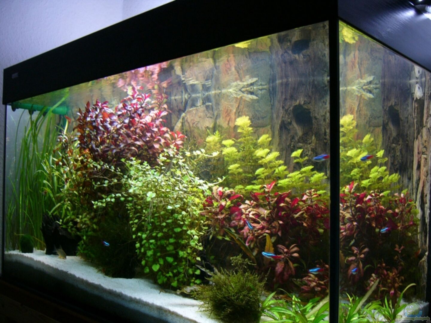 3D Aquariumrückwand in Stein & Wurzel Optik inkl. Bio Filter hinter der Rückwand (sehr grosses Filtervolumen 50x50 a5cm Hauptströmung in horizontaler Richtung (Biofilter komplett Eigenbau) Anleitung für die Biofilterung>>> http://www.back-to-nature.de/biofilter.htm http://www.backtonature.se/german/tips_filter.html http://www.walaqua.de/oberflaechenabsauger_u__co2.html Rückwand wurde angefertigt von der Firma Zoodiscount Bautzen Abdeckung von Aqualux *Biorückwandfilter [...]