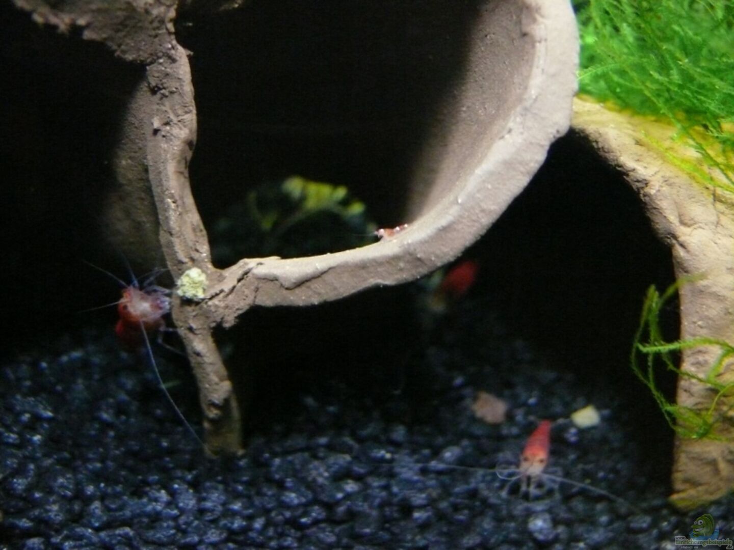 8 Caridina cf. cantonensis ´Crystal red´ (Kristallrote Zwerggarnelen) TDS 2 Geweihschnecken (Clithon sp.), 1 x braun, 1 x gelb gestreift