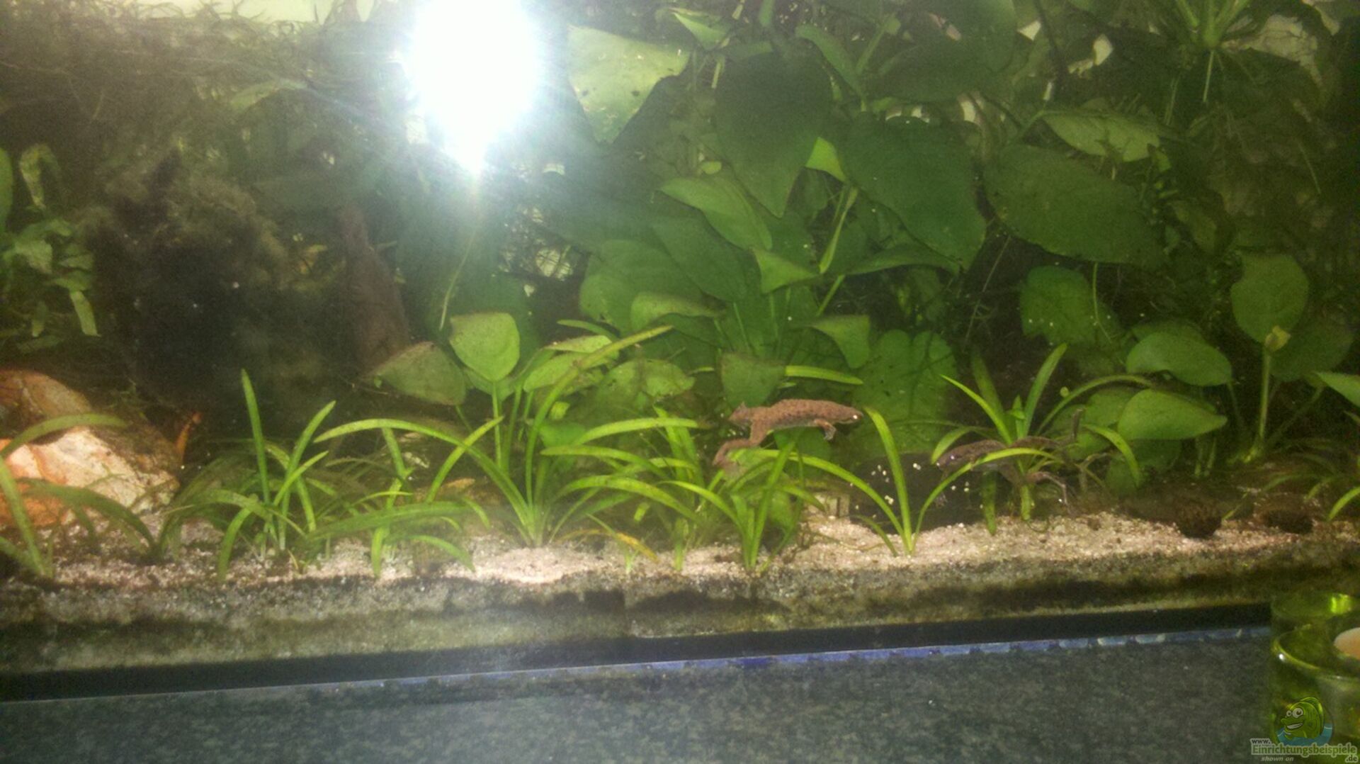 Das Becken fasst zwar 54l, es ist aber nicht ganz bis oben hin gefüllt. Optisch ist das sicherlich nicht sonderlich ansprechend. Aber ich habe mich dennoch dazu entschieden, da mir die Pflanzen, die oben aus dem Wasser ragen, ansonsten verbrennen. Au??erdem konnte ich beobachten, da?? die Zwergkrallenfrösche sich bei abgesenktem Wasserstand fast täglich an der Wasseroberfläche sonnen und dazu teilweise sogar auf die herausragenden Pflanzen kriechen.