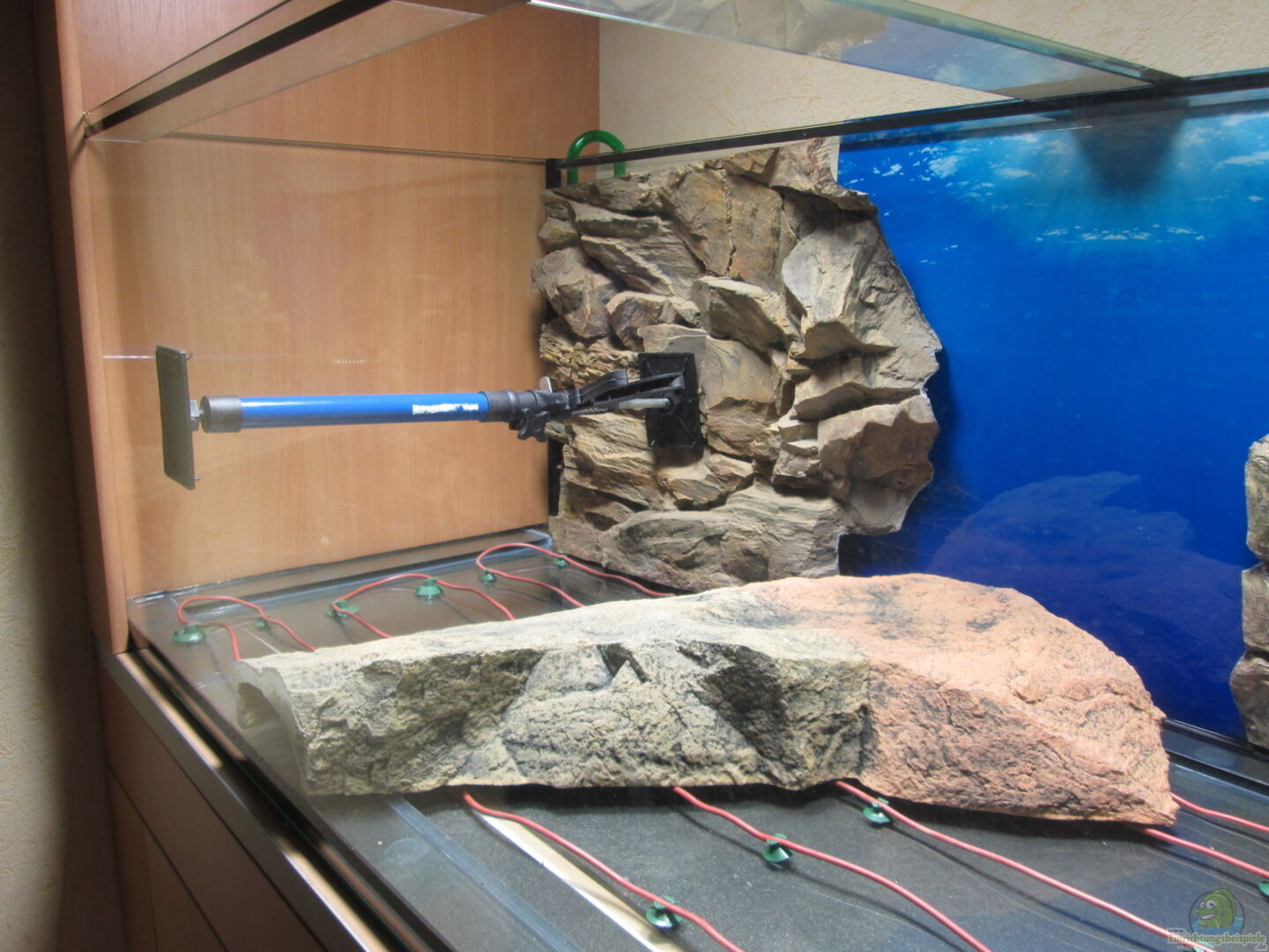 2 Rückwände 150x60cm getrennt verklebt und angepasst. Jeweils ein Ab- und ein Zulauf der beiden Filter hiter diesen Rückwänden versteckt. Hinter der linken Seitenwand befindet sich der Ablauf für den Eheim 2076 und hinter der linken Rückwand der Zulauf. Der Freiraum ist mit Würfeln aus HMF-Material aufgefüllt. (Filterfläche kann nicht Schaden). Hinter der rechten Rückwand ist der Ablauf für den Eheim 2078. Dieser sitzt auf ca der halben Beckenhöhe und wird beim Wasserwechsel als [...]