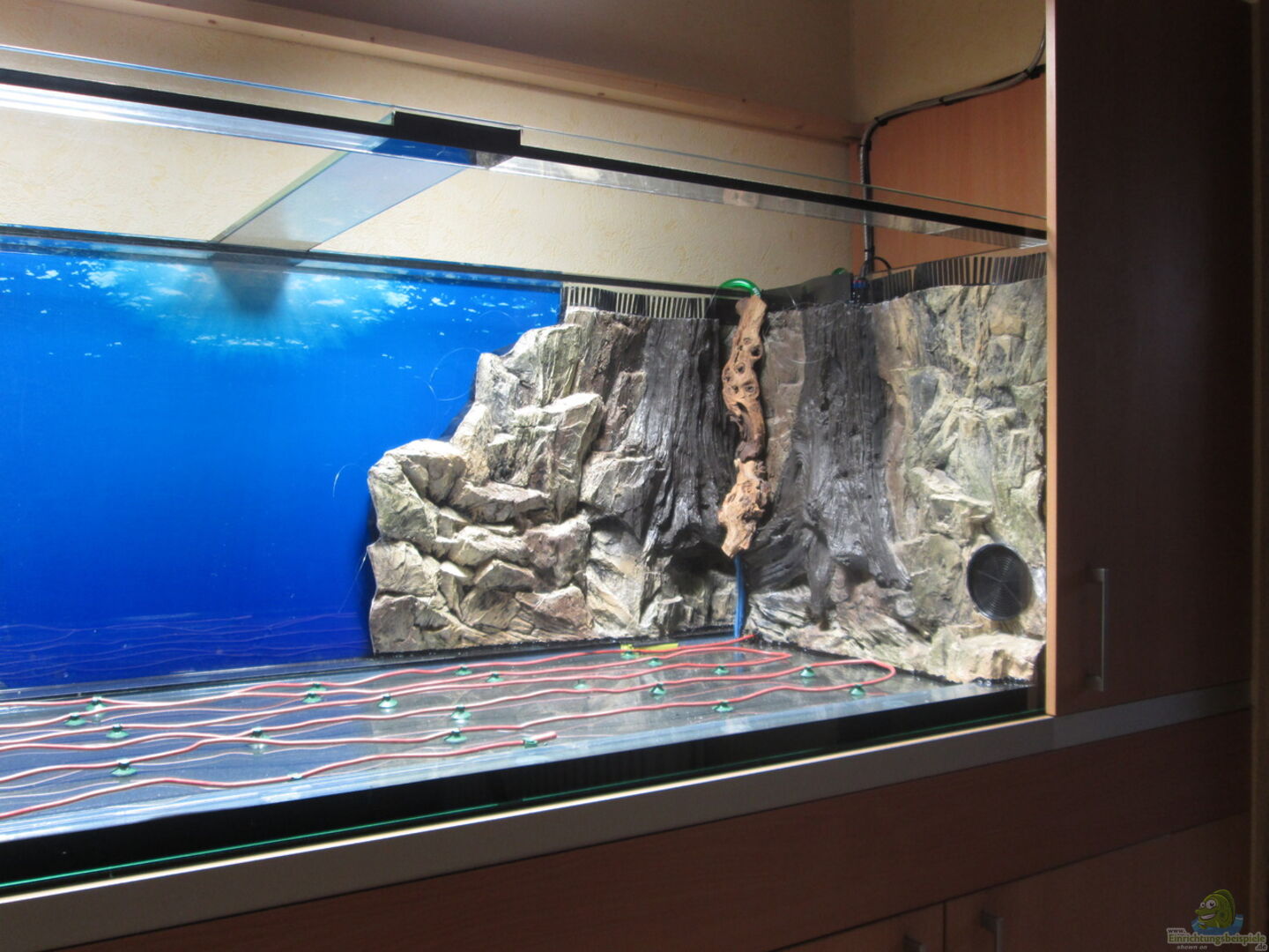 2 Rückwände 150x60cm getrennt verklebt und angepasst. Jeweils ein Ab- und ein Zulauf der beiden Filter hiter diesen Rückwänden versteckt. Hinter der linken Seitenwand befindet sich der Ablauf für den Eheim 2076 und hinter der linken Rückwand der Zulauf. Der Freiraum ist mit Würfeln aus HMF-Material aufgefüllt. (Filterfläche kann nicht Schaden). Hinter der rechten Rückwand ist der Ablauf für den Eheim 2078. Dieser sitzt auf ca der halben Beckenhöhe und wird beim Wasserwechsel als [...]