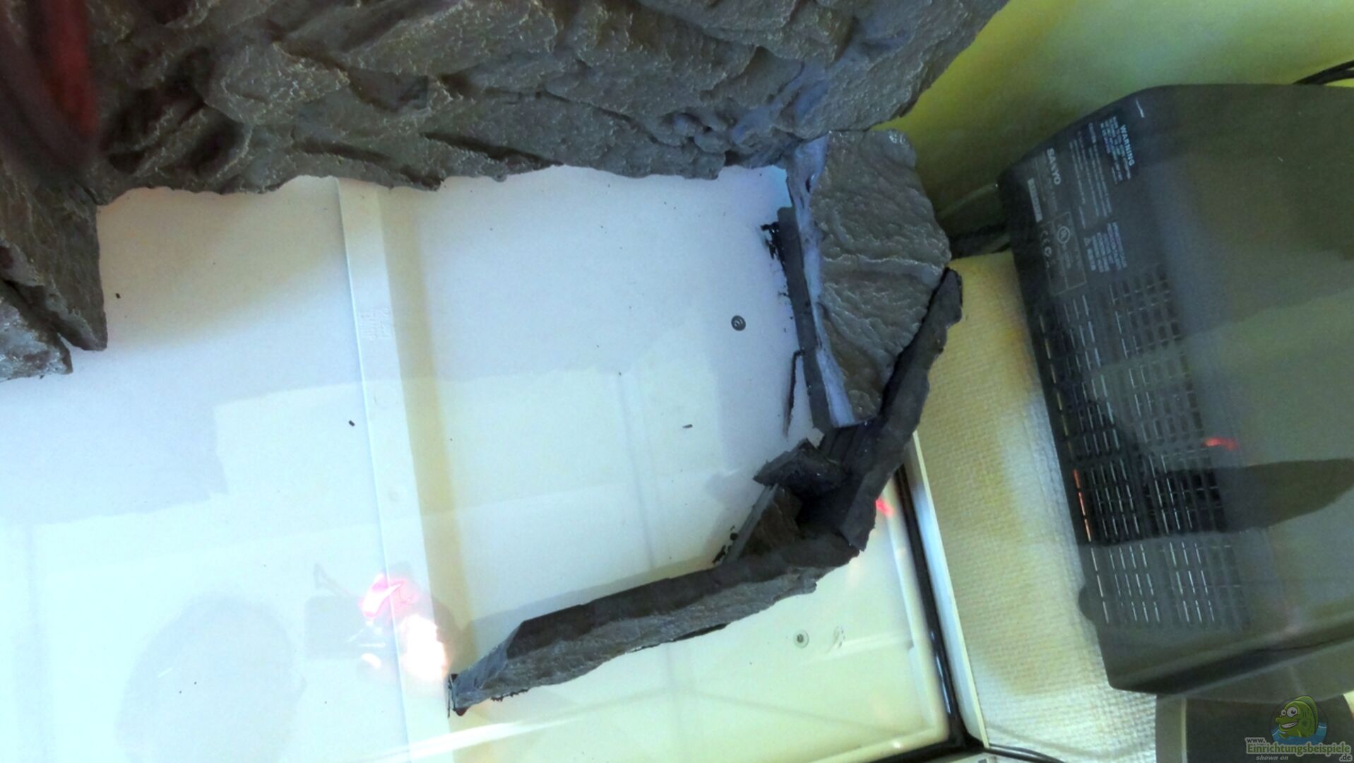 Juwel Stone Granite Rückwand Juwel Filtercover Stone Granite Ein gro??er wei??er Imitat-Lochstein (aus Plastik) Eine Mangrovenwurzel Zwei Lavasteine mit aufgesetzem Sternkraut (Pogostemon helferi) Einige Holzröhren Seemandelbaumblätter, Buchen- und Eichenlaub, Erlzapfen