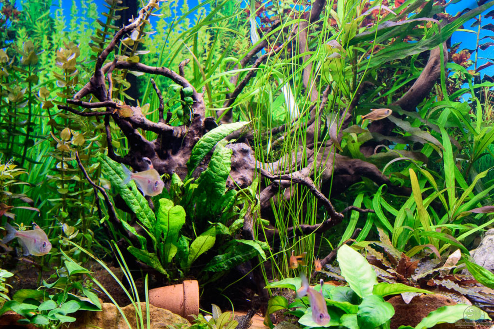 Die Rückwand: Es ist eine schwarze Folie, von au??en verklebt. <`)))))><__<`)))))><__<`)))))>< Der Unterbau: Das Aquarium steht nicht auf einem gewöhnlichen Unterschrank. Ich habe für dieses Becken den Unterbau selbst gefertigt. Wasserfest verleimte Multiplex-Platten und dazwischen habe ich Gasbetonsteine als "E" verklebt welche tapeziert wurden. Dieser Unterbau hat einige Bohrungen für die Elektroleitungen und Schläuche. Benötigte [...]