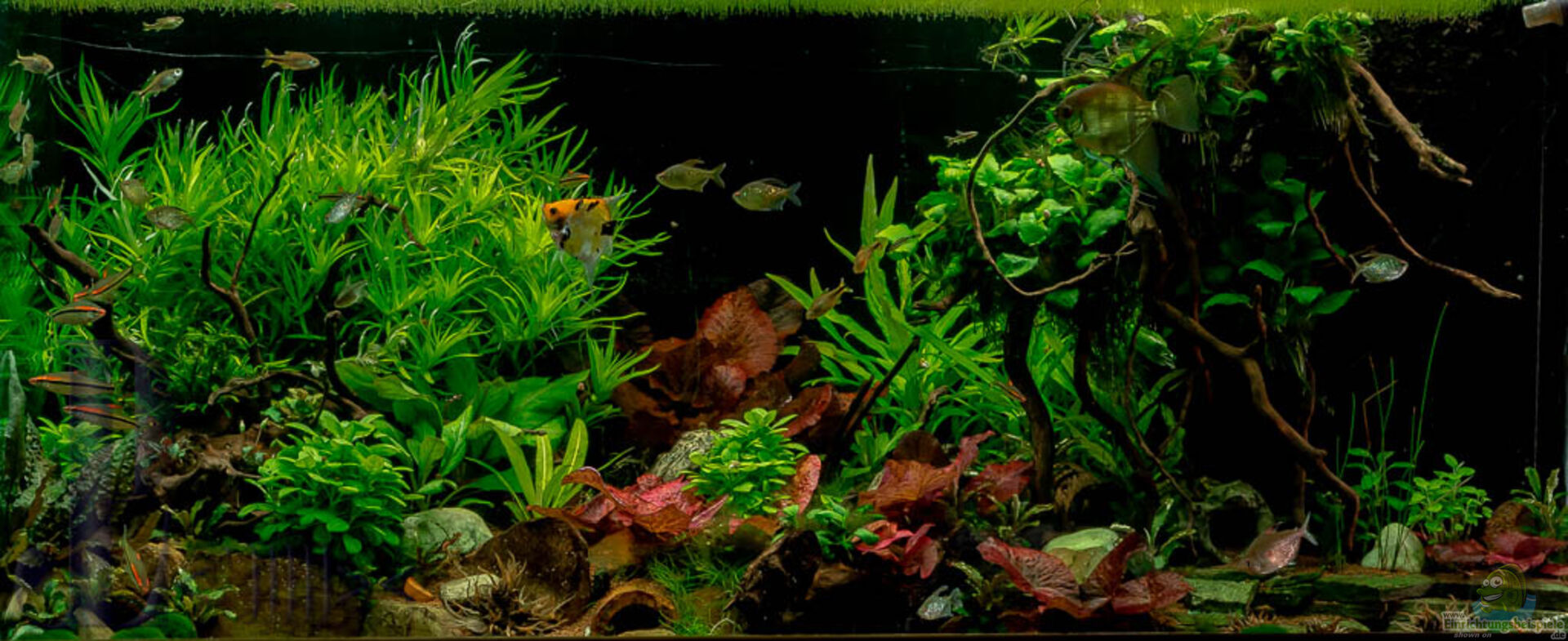 Das Rechteck-Becken besteht aus 15 mm starken Glas und hat 2 3/4" Bohrungen im Boden. Diese Bohrungen habe ich mit Tankverschraubungen und Kugelhähnen versehen und so eingerichtet, dass ich diese für die Wasserwechsel nutzen kann da ich keinen Au??enfilter betreibe. Auslauf und auch der Zulauf sind mit stehenden Rohren so eingerichtet, dass max. 100 Liter über den Auslauf /bzw 150 Liter Wasser über den Zulauf aus dem Becken laufen können. Ablauf und Zulauf befinden sich in einem ???Technikraum??? [...]