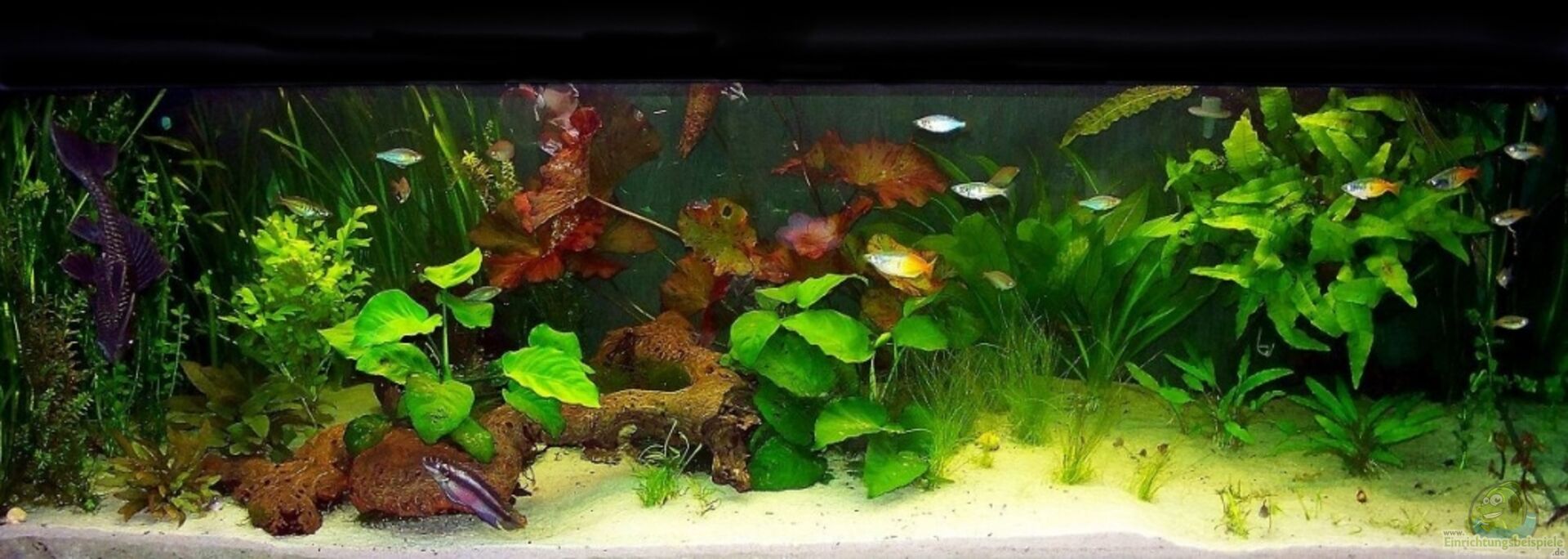 * Klassisches Rechteckaquarium mit stabilisierter Anrichte aus Holz als Unterschrank. * Als Rückwand habe ich einfach schwarz-graues Krepppapier hinters Aquarium platziert und zwischen Glas und Papier ein paar künstliche Pflanzen geklemmt. Habe dadurch eine gute Tiefenwirkung erreicht. Die Valisnerien im Hintergrund passen gut dazu.