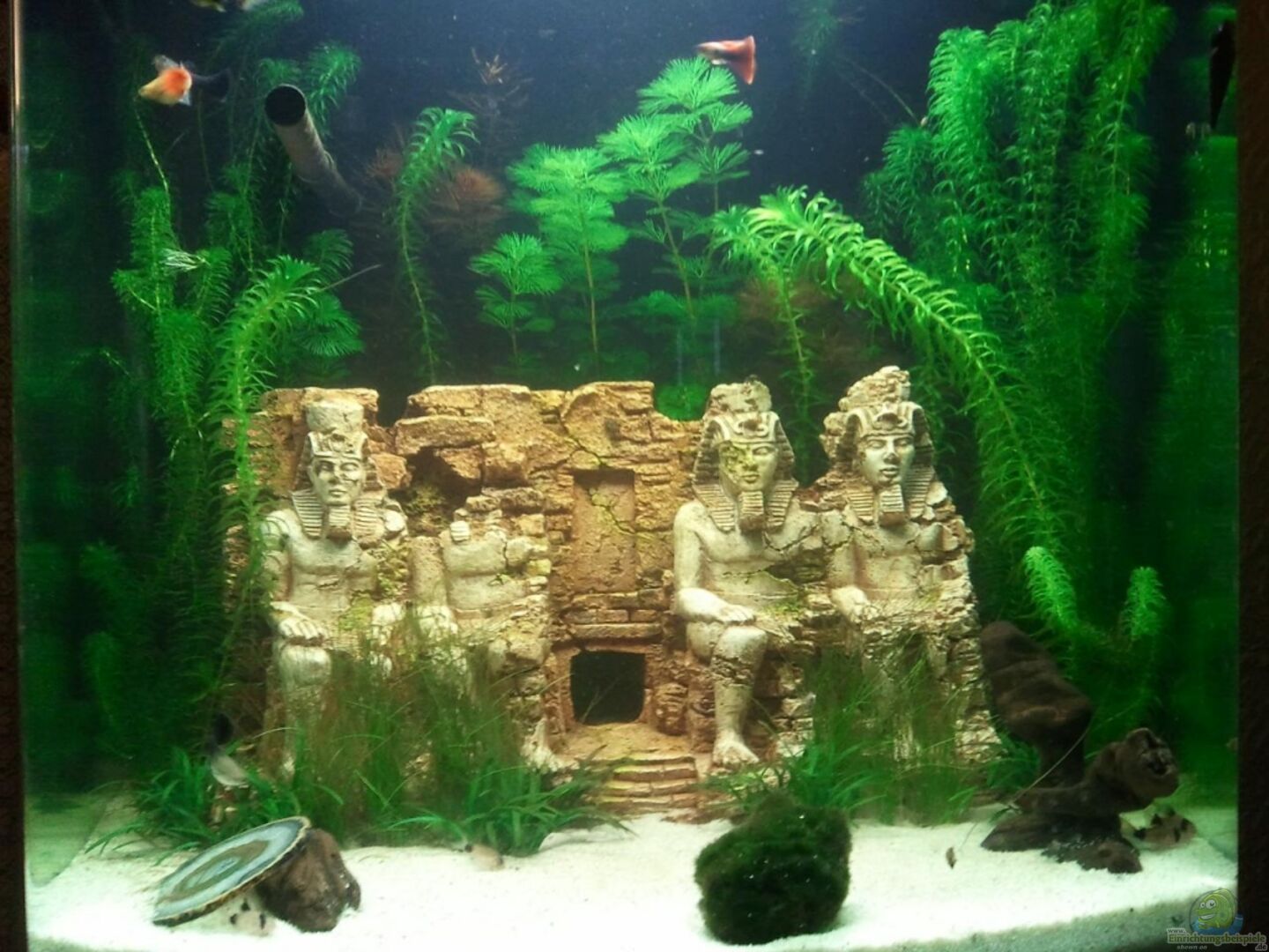 Aquarium mit gebogener Frontscheibe, Glas geschliffen und poliert. Der Cube bietet eine beeindruckende Tiefe, so steht der Abu Simbel relativ mittig, dahinter ist ein recht dichter ´Wald´.