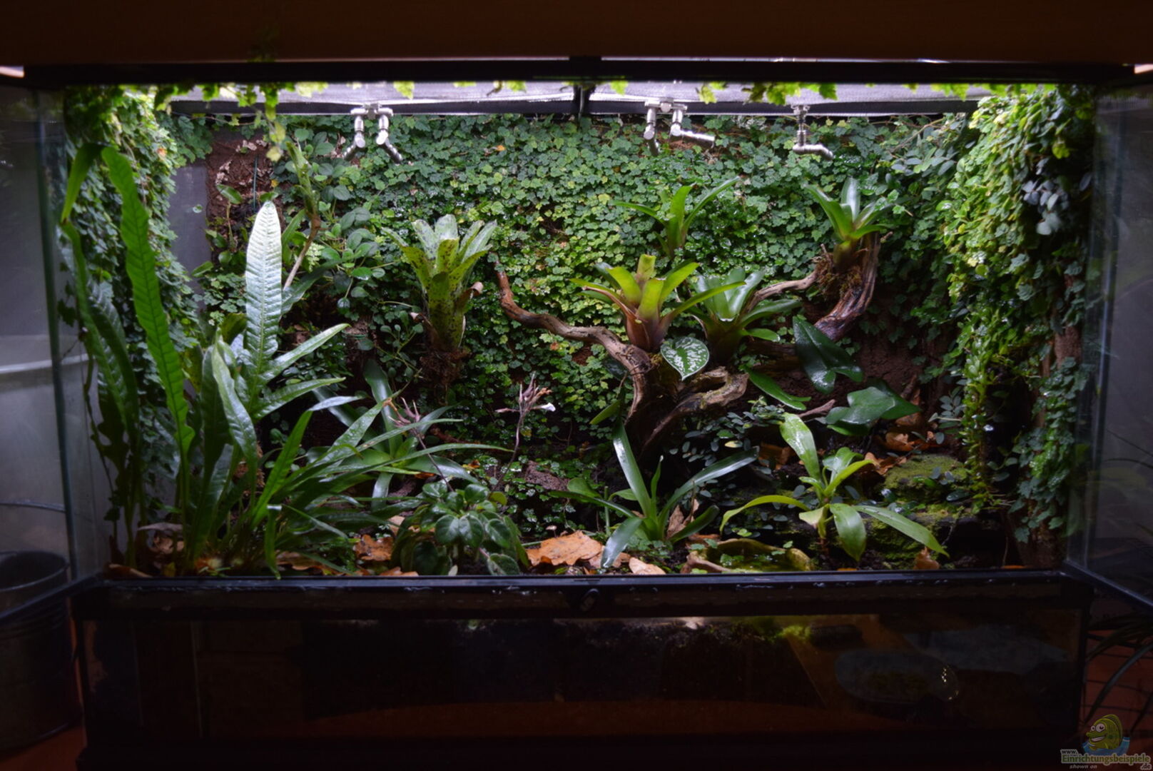 Die Rückwand besteht aus ca. 1-2 cm dicken Xaximstücken, die ich mit Aquariensilikon ans Glas geklebt hab. Zwischenräume wurden belassen. Diese hab ich anschliessend mit einem RFB-Substrat ausgefüllt. Das ist eine klebrige Masse aus Klebstoff und Torf, die einfach ans Glas gedrückt wird. Danach muss es ca. ne Woche trocken. Aus ihm wachsen mit der Zeit Moose und Farne.RFB-Substrat Xaxim (gesprochen Schaschim), ist der neuseeländische Baumfarn, den man in Scheiben geschnitten u.a. hier [...]
