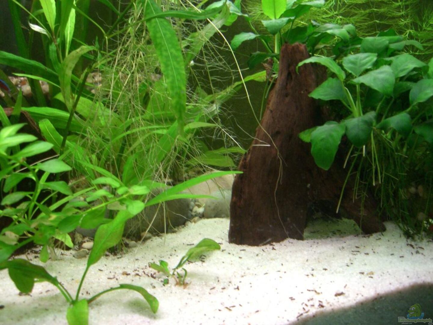 Um die gro??e Höhe etwas zu überbrücken, habe ich streifen aus Plexiglas geschnitten (vorderseite geschwungen). Diese dann mit Kies beklebt und diese als Terrassen an den beiden Rückwänden mit Lebensmittelsilikon installiert. Anschlie??end auf jede einzelne Terrasse Javamoos gebunden (mit Angelschnur).