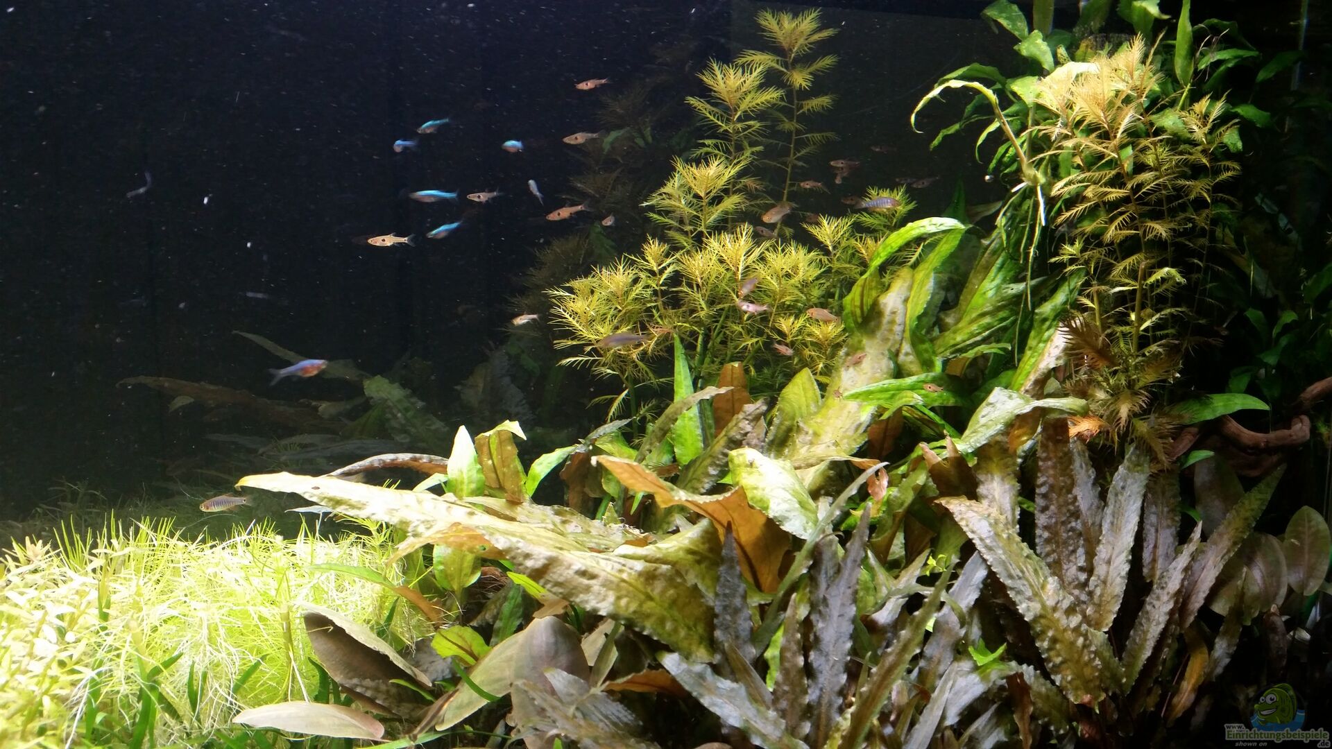 -Aquarien Anfertigung mit 1 cm dickem glas. -Bohrung für Filter und Kabel. -Schiebe Abdeckung aus Glas und wei??er Folie. Durch die Einfassung der Schieber, läuft kein Schwitzwasser au??erhalb runter. -Unterschrank Braun und mit Kiesleiste. -Von 3 Seiten einsehbar. -3 Glasquerstreben zum aufsetzen der LEDs