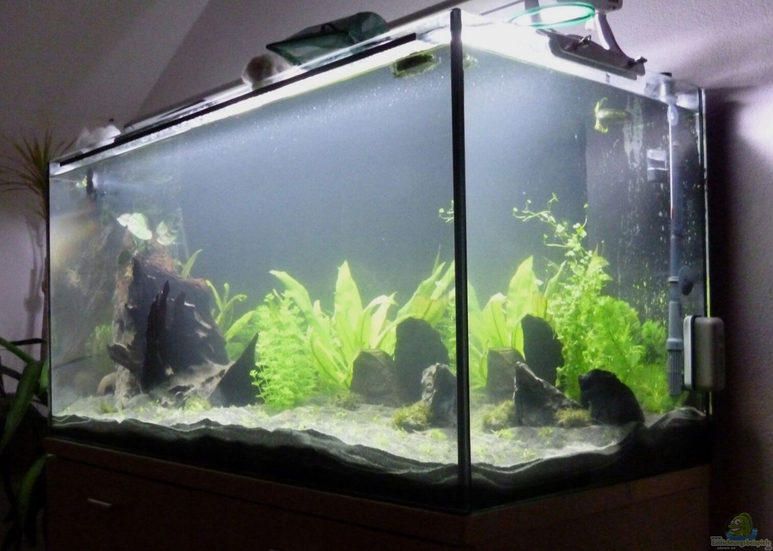 "Alpen meets Amazonas" ist ein Neustart meines Beckens "American Dream", welches von Dez. 2011 bis Jan. 2013 wegen Umzugs leer stand. Die darin gehaltenen Fische werden dem alten Bestand recht ähnlich werden, das Pflanzendesign soll jedoch "modernisiert" werden. ~ Der Unterschrank (Vollholz) ist eine Ma??anfertigung vom Tischler passend zur Wohnzimmermöblierung.
