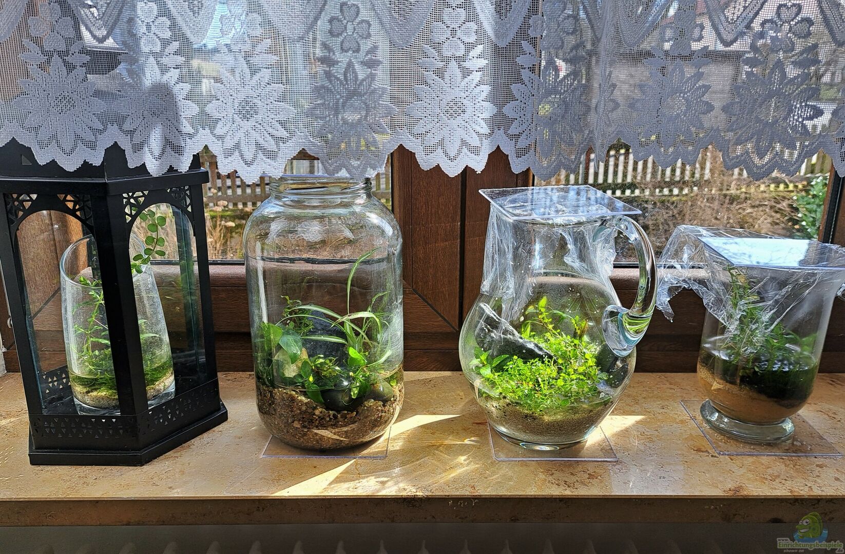 Das angegebene Volumen bezieht sich auf das Glasbecken in dem zur Zeit die meisten der Gläser untergebracht sind. Das Hauptbild zeigt einen Teil von zur Zeit Gefäßen. 1 Liter Fassungsvermögen musste ich vom System her mindestens angeben. In jedem der Gefäße befinden sich real maximal 2 Zentimeter hoch Wasser. Es ist mein erster Versuch mit "richtigen" Wabi Kusas. Im Moment befinde ich mich absolut im Experimentierstadium. Ich hätte nie gedacht, das Pflanzen so spannend sein [...]