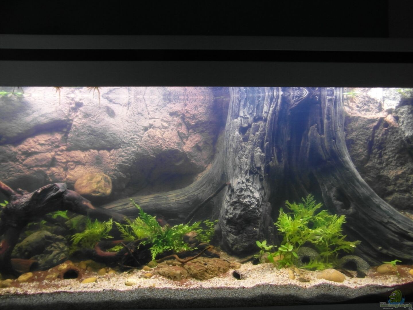 Hinterschwimm, kriech- und krabbelbare Rückwand, welche an den unteren und seitlichen Kanten nur punktuell mit JBL Haru verklebt wurde. Das Wasser kann somit u.a. durch die entstandenen "Verklebelücken" zirkulieren. Darüber hinaus ist der hintere Bereich der Rückwand durch einen 7 x 5 cm gro??en Durchgang zugänglich, welcher sich im linken unteren Bereich befindet. Auch hier gelangt Wasser hinter die Rückwand um einem Stillstand des Wassers entgegen zu wirken.