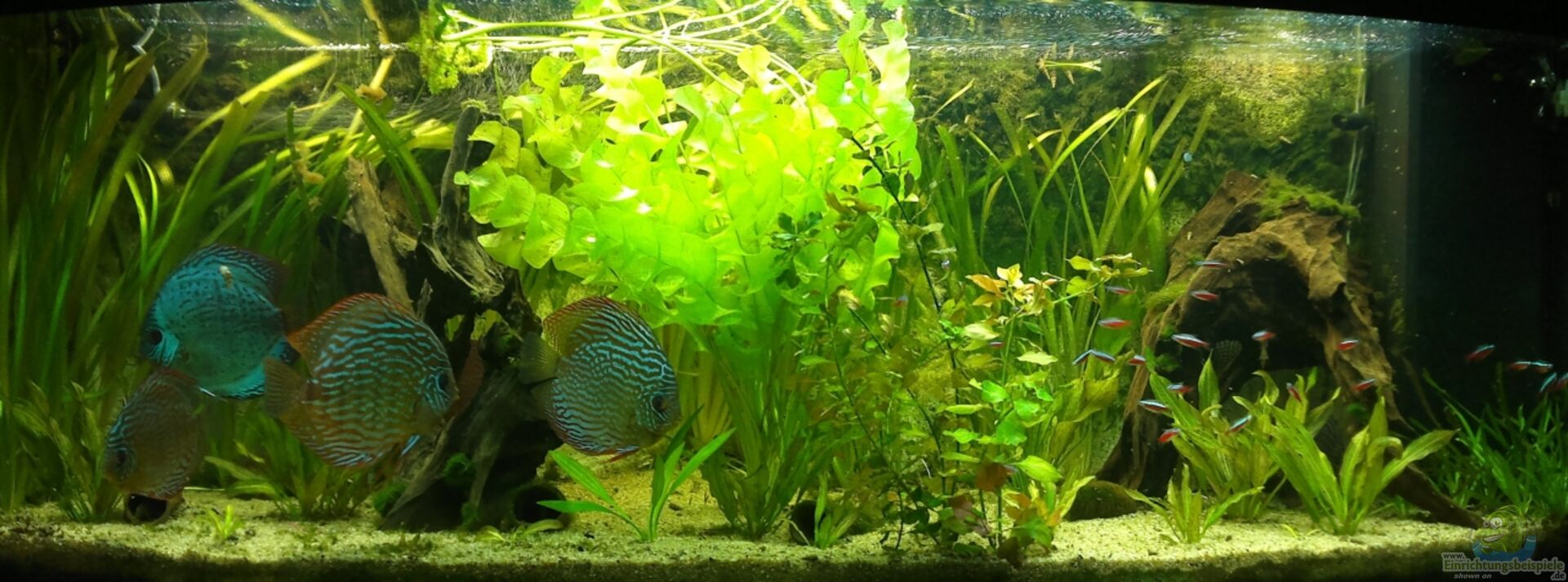 Im Becken befinden sich insgesamt 3 Wurzeln, wovon 2 Wurzel recht gro?? und so angeordnet sind, dass sich die Diskusfische zurückziehen können. Die Diskus können zudem zwischen den Valisnerien und in der "aponogeton ulvaceus" nach Schutz suchen ... Des Weiteren existieren mehrere Welshöhlen. (derzeit keine Welse ausser L27 und den Corys ...) Und es gibt noch eine Kokosnusshalbschale ....