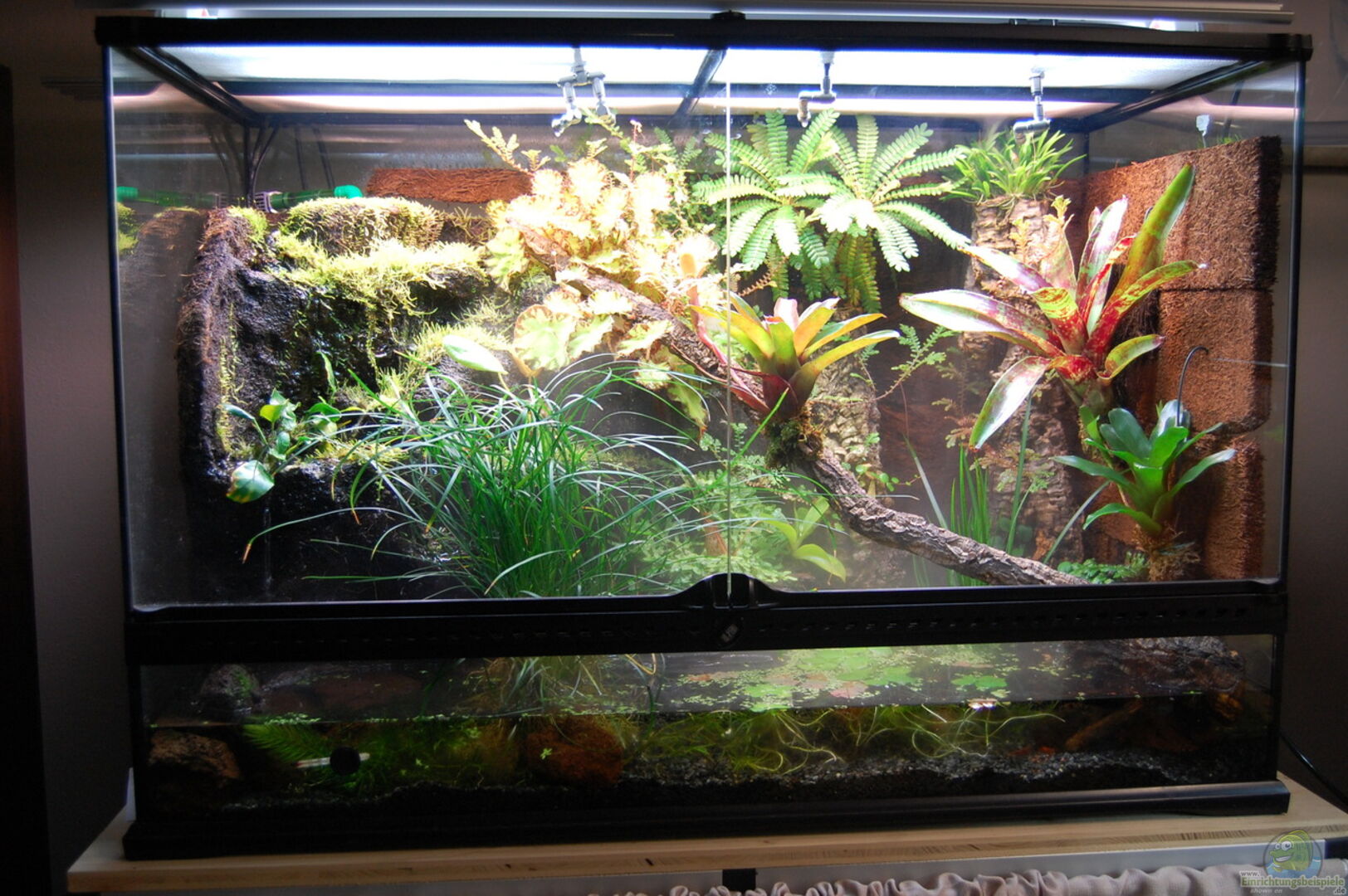 Rückwand besteht aus 1-2 cm dicken Xaxim-Platten (Neuseelandfarn), die mit Aquariensilikon festgeklebt wurden. Als weitere Deko-Elemente verwende ich hohle Korkeichenrinde, welche bepflanzt sind, Lava-Gestein und Weisstorfplatten. Die folgenden Bilder zeigen die Veränderung des Terrariums im Laufe der Zeit mit Datumsangabe.