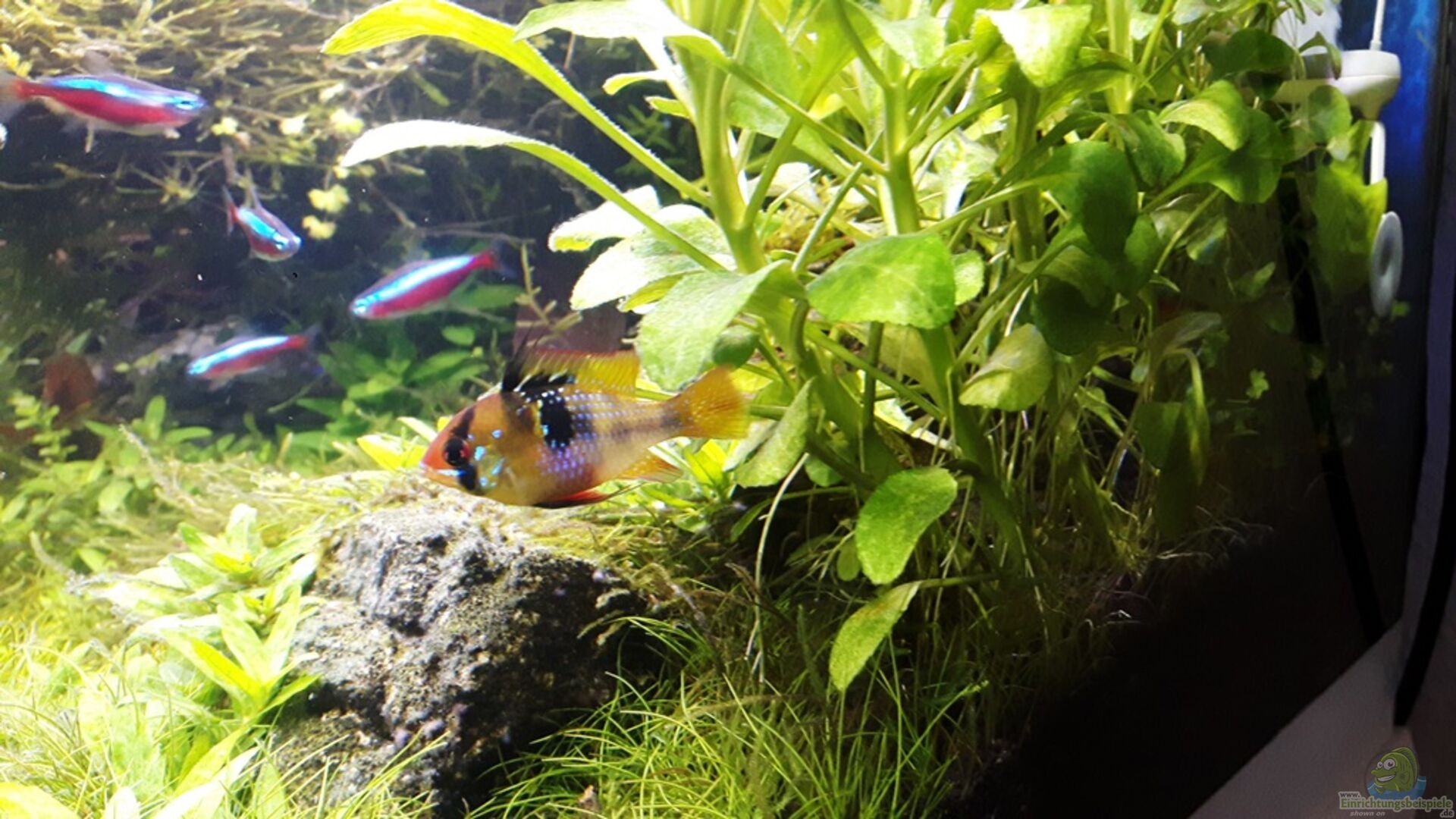 6 Zwergpanzerwelse Corydoras habrosus 1 Schmettelingsbuntbarsch Männchen 2 Schmettelingsbuntbarsch Weibchen(wegen der Strssverteilung) 20 Neontetras 50, 3 ? Zwerggarnelen TDS