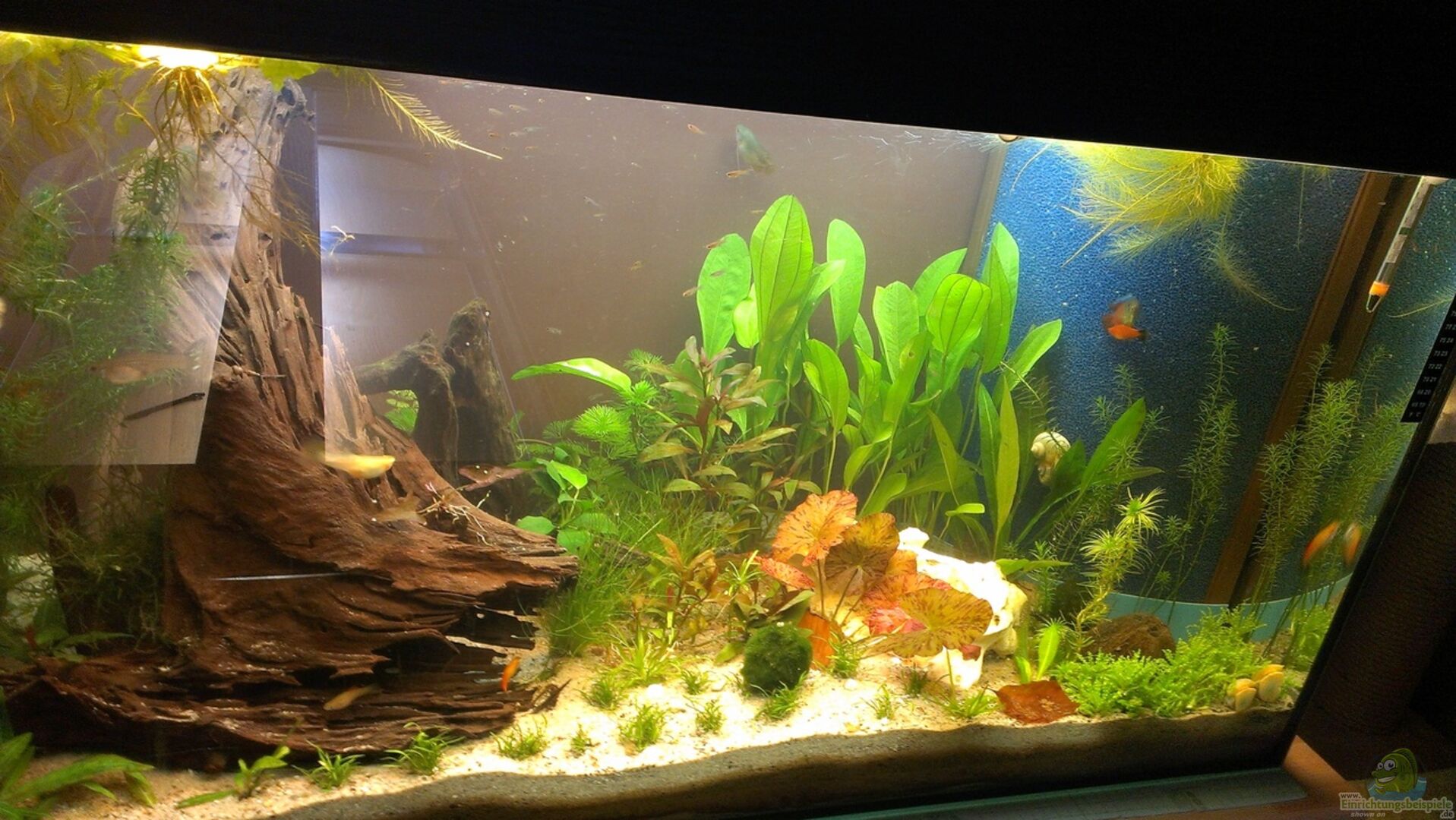 Links und Rechts sind unter den Querstreben Abdeckung vom Kabelkanal angeklebt. Der befindet sich auf Wasserspiegelhöhe und hält somit die Schwimmpflanzen in der linken und rechten Ecke. Schön für meine Fadenfische.