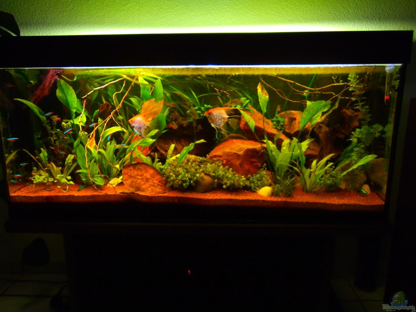 Aquariumschrank ist ein Eigenbau aus Arbeitsplatten in Nussbaumoptik. Die Rückwand ist einfach ein zugeschnittener Karton, den ich schwarz angestrichen habe. Das macht einen tiefern eindruck und der Hamburger Mattenfilter fällt auch nicht mehr so auf. Entschuldigt die teilweise schlechte Bildqualität. Viele Bilder wurden mit der Handykamera aufgenommen.
