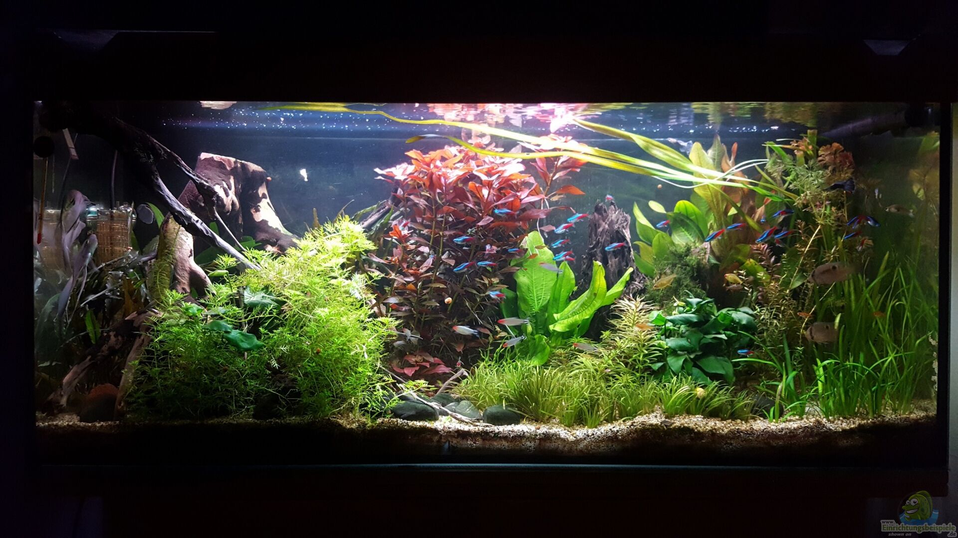 Das Becken ist ein Floatglas Becken mit Sto??verklebung, hatte diese Jahrelang offen, nach dem Umzug habe ich mir dann eine Juwel Abdeckung besorgt, mit T8 Röhren ausgestattet. Habe diese später durch LED ersetzt Die Rückwand habe ich mit schwarzer Posterfolie abgedeckt. Da da Becken leider schon auf seinen Platz stand und schon eingerichtet, konnte ich diese leider nur schwer befestigen.