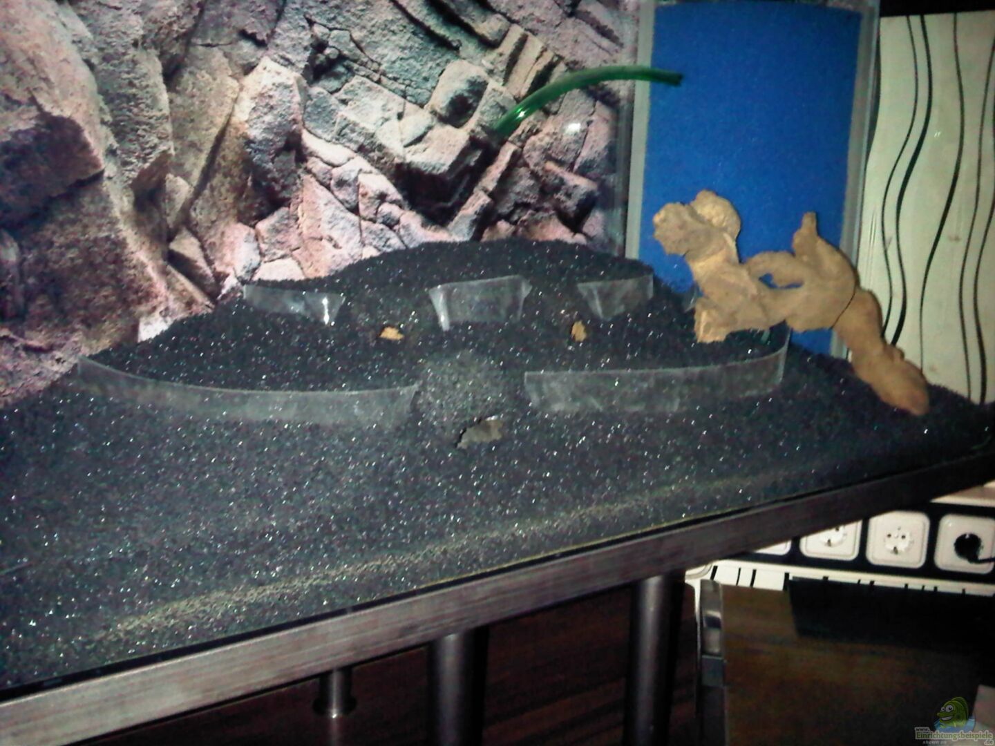 3 Ebenen über 2 Terassen dargestellt. Die Terassen wurden mit Plexiglas ´zum halten gebracht´. Auf dem Plexiglas ist mit Aquariumsilikon der Bodengrund aufgeklebt. In den Terassen eingearbeitet wurden drei Höhlen aus halben Kokusnussschalen, ebenfalls mit Bodengrund beklebt.