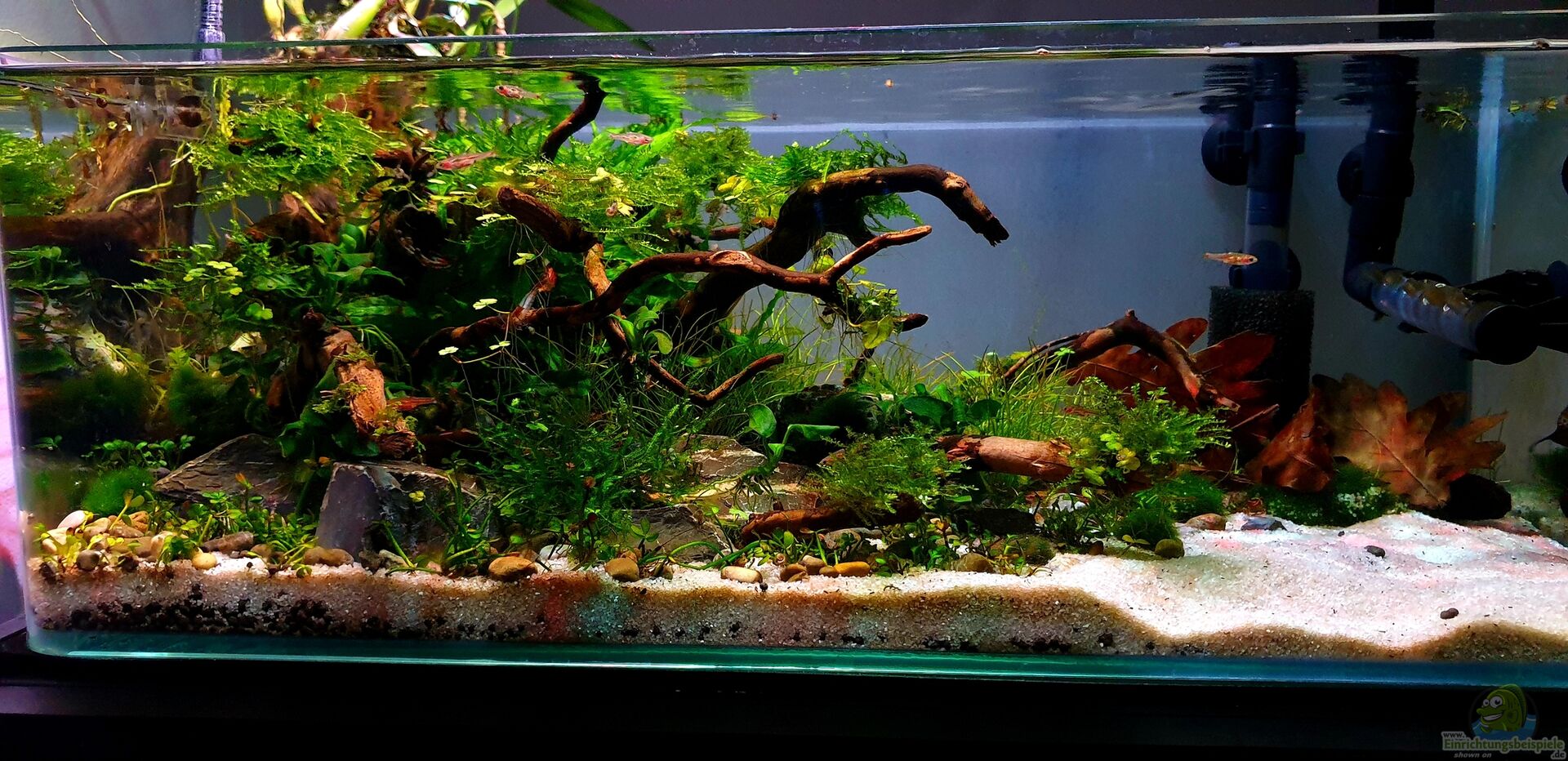Besonders flaches Rechteck-Aquarium mit 17 Liter Inhalt und abgerundeten Ecken an der Frontscheibe. Hergestellt aus besonders hochwertigem Floatglas(Hersteller Blau Aquaristic) Erstes Aquascape/Naturaquarium, das einen seichten Nebenfluss darstellen soll bei dem Wurzeln hineinragen und eine dichte Randbepflanzung aufweisst und durch die Bepflanzung und Schwimmpflanzen teilweise beschattet wird.