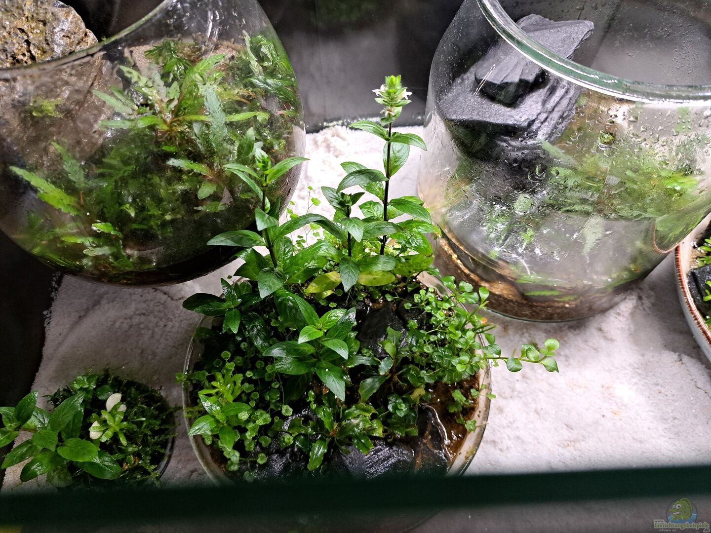 Das angegebene Volumen bezieht sich auf das Glasbecken in dem zur Zeit die meisten der Gläser untergebracht sind. Das Hauptbild zeigt einen Teil von zur Zeit Gefäßen. 1 Liter Fassungsvermögen musste ich vom System her mindestens angeben. In jedem der Gefäße befinden sich real maximal 2 Zentimeter hoch Wasser. Es ist mein erster Versuch mit "richtigen" Wabi Kusas. Im Moment befinde ich mich absolut im Experimentierstadium. Ich hätte nie gedacht, das Pflanzen so spannend sein [...]