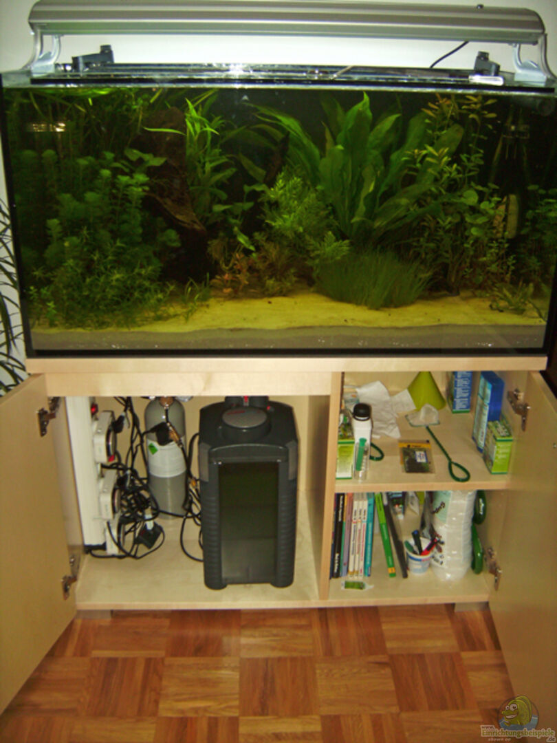 ~ Offenes Aquarium mit Hängeleuchtbalken (der derzeit noch nicht hängt^^). ~ Der Unterschrank (Vollholz) ist eine Ma??anfertigung vom Tischler passend zur Wohnzimmermöblierung. ~ Ich schreibe ein Tagebuch mit, in dem alle Arbeiten, Wasserwerte, Veränderungen und Besonderheiten eingetragen werden um einen ??berblick über das Becken zu behalten.