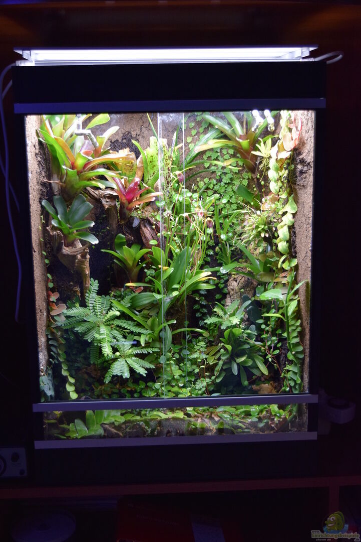 Kunstoff-Terrarium aus Hartschaum-PVC mit integriertem Lichtkasten Gesamthöhe 78 cm Schiebescheiben mit Silikondichtung und umlaufendem Profil Lüftungsgaze drosophiladicht 2 Bohrungen für Beregnungssystem von Micro Rain von M.R.S.-Technik, insgesamt 4 Neblerdüsen aus Edelstahl mit angeschlossenem 15l Tank mit Osmosewasser