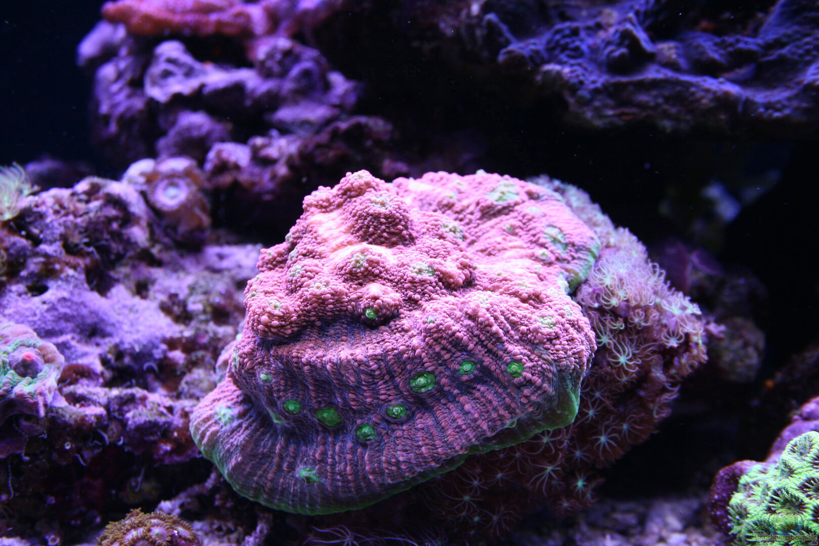 2 x Amphiprion ocellaris - Falscher Clown - Anemonenfisch 1 Synchiropus stellatus - Sternen-Mandarinfisch 3 x Calcinus laevimanus - Großscheren-Einsiedlerkrebs verschiedene Scheiben- und Krustenanemonen 1 x Entacmaea quadricolor - Blasenanemone verschiedene Acropora Caulastrea furcata Acanthastrea Montipora "Superman" Capnella imbricata ??? Keniabäumchen grün und lila Gorgonien Chalice Sinularia brassica grün