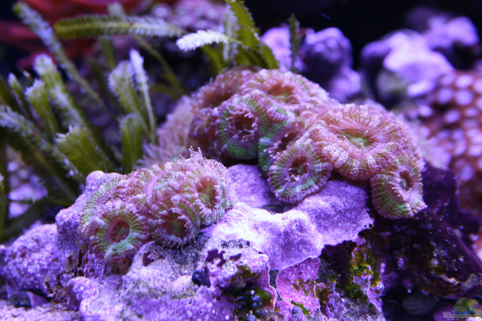 2 x Amphiprion ocellaris - Falscher Clown - Anemonenfisch 1 Synchiropus stellatus - Sternen-Mandarinfisch 3 x Calcinus laevimanus - Großscheren-Einsiedlerkrebs verschiedene Scheiben- und Krustenanemonen 1 x Entacmaea quadricolor - Blasenanemone verschiedene Acropora Caulastrea furcata Acanthastrea Montipora "Superman" Capnella imbricata ??? Keniabäumchen grün und lila Gorgonien Chalice Sinularia brassica grün