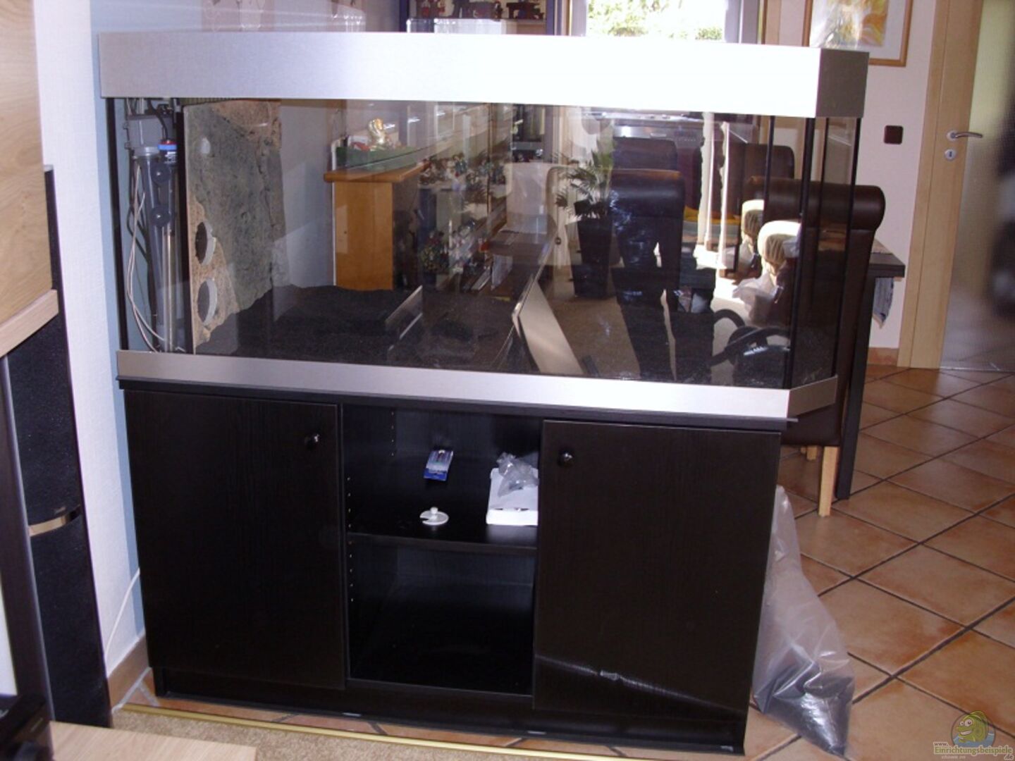 Das Aquarium wurde über meinen Händler, Aquarium Tonndorf in Hamburg, von einem Aquariumbauer als Raumteiler angefertigt. Die in den Raum hineinragende Seite ist durch 2 zusätzliche Scheiben abgeschrägt und verbessert die Optik. Viel besser als eine Rundung. Das Becken hat eine 5 cm Kiesblende und oben eine 11 cm Blende. Beides in Aluminium-Look. Das ganze steht auf einem Unterschrank in Esche schwarz. Der Schrank ist 10cm kleiner als das Becken. Das Becken steht also etwas über.Pa??t perfekt. 3D-Rückwand, [...]