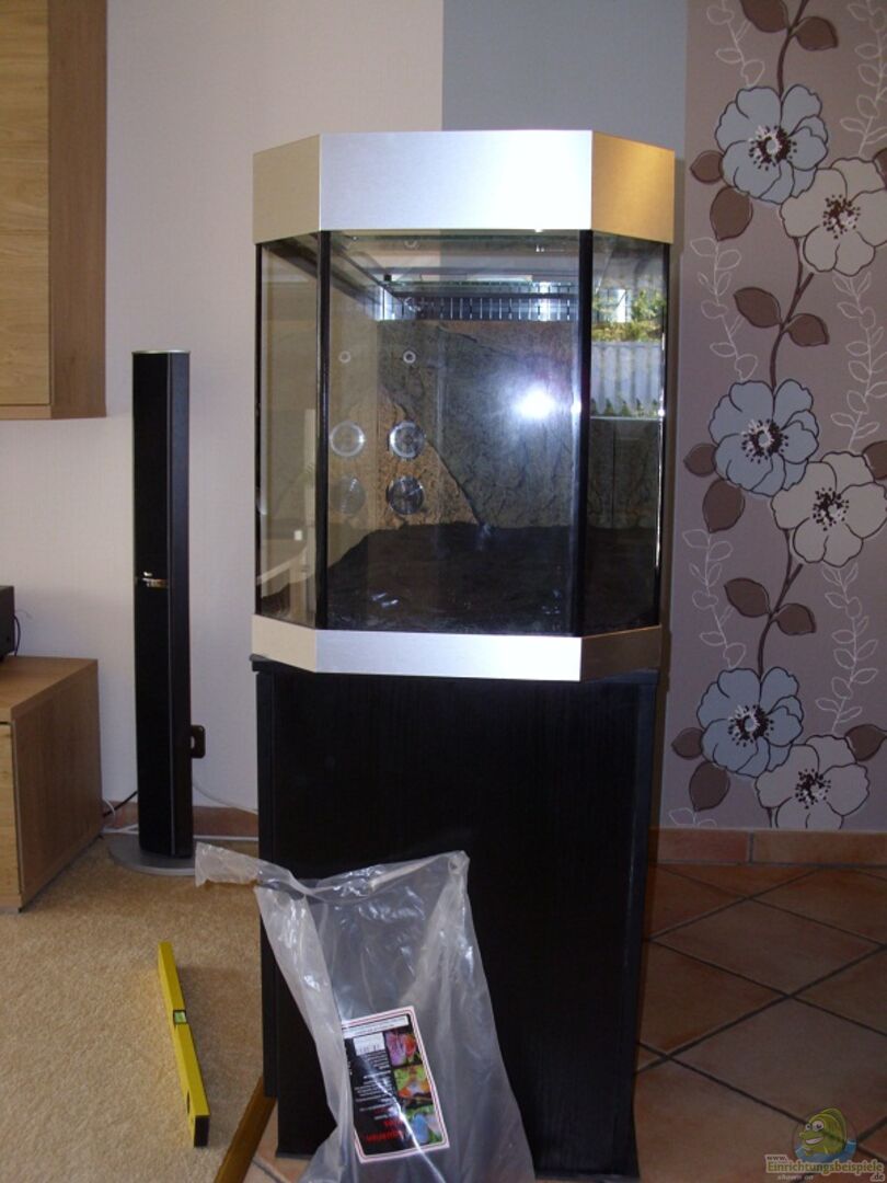 Das Aquarium wurde über meinen Händler, Aquarium Tonndorf in Hamburg, von einem Aquariumbauer als Raumteiler angefertigt. Die in den Raum hineinragende Seite ist durch 2 zusätzliche Scheiben abgeschrägt und verbessert die Optik. Viel besser als eine Rundung. Das Becken hat eine 5 cm Kiesblende und oben eine 11 cm Blende. Beides in Aluminium-Look. Das ganze steht auf einem Unterschrank in Esche schwarz. Der Schrank ist 10cm kleiner als das Becken. Das Becken steht also etwas über.Pa??t perfekt. 3D-Rückwand, [...]