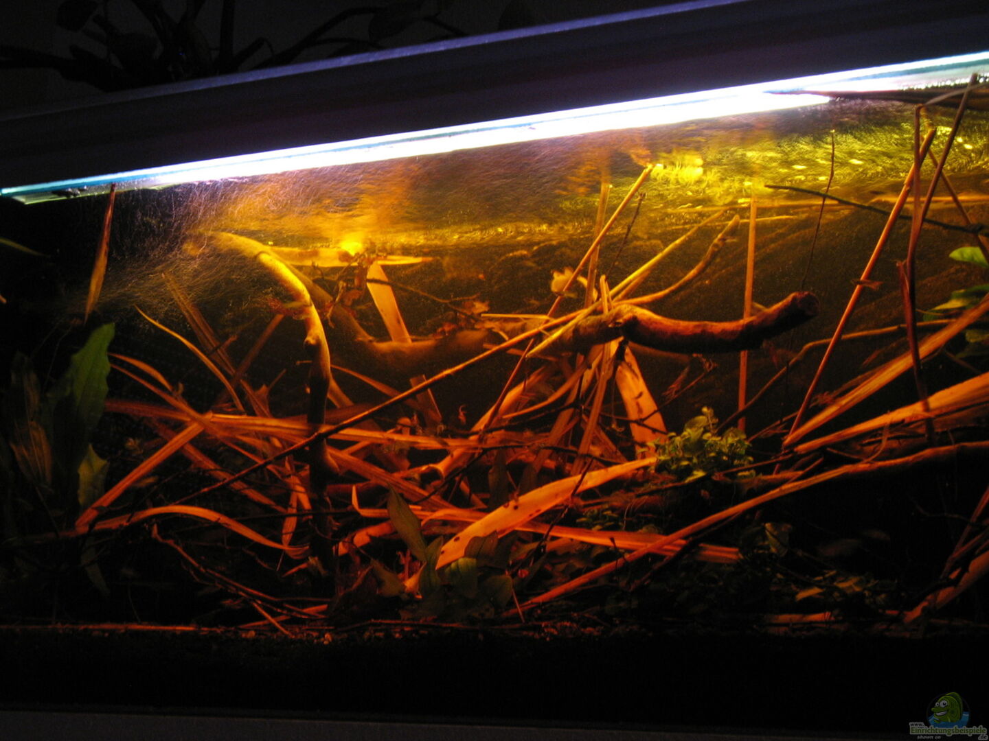 Standard Becken aus Float Glas, sto??verklebt mit Mittel- und Seitenstegen. Aquarien Aluminium Abdeckung "Stratos" von Gie??emann inkl. T5 Leuchtbalken. Momentan werden aber 2 T8 Leuchtbalken benutzt. Unterbau aus Ytong Steinen, verkleidet mit Sperrholz Pappel und wei??er Rauhfasertapete tapeziert. Daneben die Techniksäule aus Spanplatten, ebenfalls tapeziert. Verdeckt Filter, Kabel, UVC Klärer etc. und wird bei Bedarf einfach beiseite geschoben. Die Idee hinter der Gerstaltung: . [...]