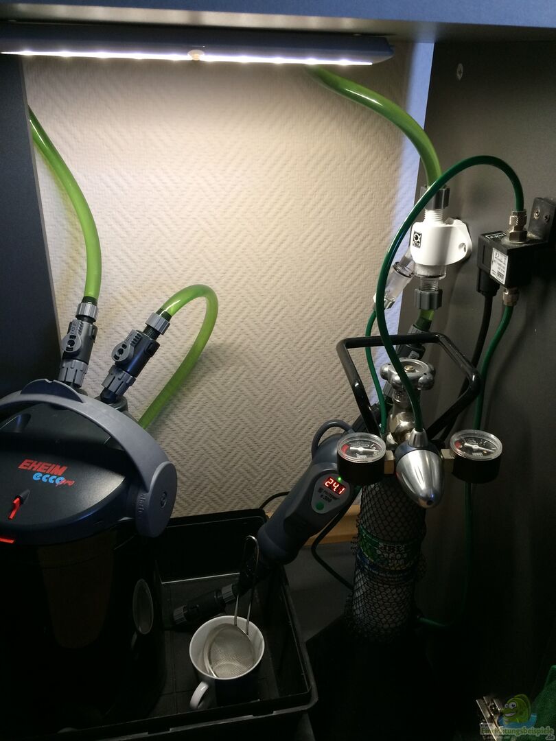 * Eheim Skim 350 mit Garnelen/Schneckenschutz im Ansaugtrichter * 6fach Steckdosenleiste mit Ueberlastungsschutz, jeder Verbraucher ist einzeln schaltbar * Simu-Lux LED Steuerung 5 Kanäle (Steuerungszeiten siehe unter Beleuchtung) * Dennerle Quantum 300 mit Nachtabschaltung (Magnetventil) CO2 Zugabe erfolgt 30 min. nach einschalten der Beleuchtung und endet 30 min. vor Abschaltung der Beleuchtung * 2 Kg CO2 Vorratsflasche * JBL Hochleistungs Direktdiffusor * [...]