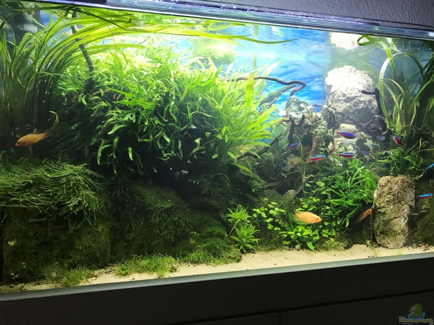 Ich habe mir ein Weissglas AQ zugelegt, da hier die Farben der Fische und Pflanzen noch besser "rüberkommen". Habe mir im Nachgang von meinem Schreiner noch einen neuen Unterschrank bauen lassen.