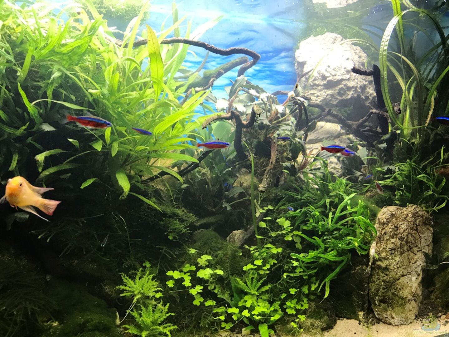 Ich habe mir ein Weissglas AQ zugelegt, da hier die Farben der Fische und Pflanzen noch besser "rüberkommen". Habe mir im Nachgang von meinem Schreiner noch einen neuen Unterschrank bauen lassen.
