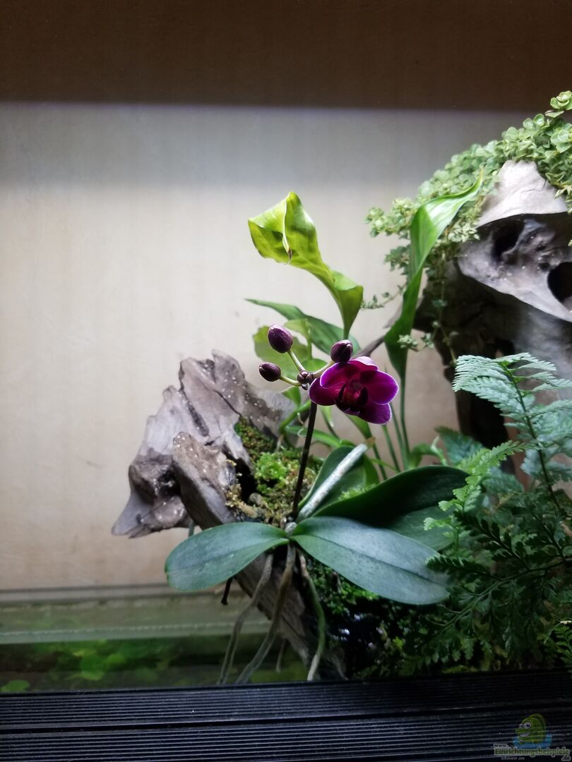 Das Becken wurde im Oktober 2018 neu eingerichtet. Es ist ein offenes Becken. An der rechten Seite steht eine Gro??e Wurzel, die aus dem Wasser steht, mit Bewuchs. Nicht alle Pflanzen sind aus dem Asiatischen Raum, hier wurde mehr auf eine schöne zusammenstellung geachtet, vermutlich werde ich hier noch in Zukunft weiter anpassen. Neu ist hier auch eine Vanille Orchidee die im moment sehr schön am Wachsen ist.
