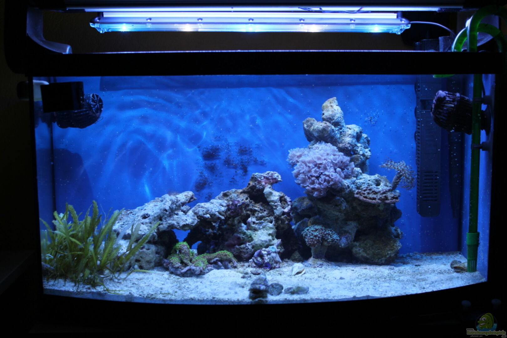 - Becken mit gebogener Frontscheibe, deshalb die unterschiedlichen Breiteangaben. - Die Rückwand und die rechte Seitenscheibe ist mit einer dunkelblauen Folie beklebt worden. - Plexigla??bodenplatte zum Schutz vor Gla??bruch - Plexigla??abdeckscheibe