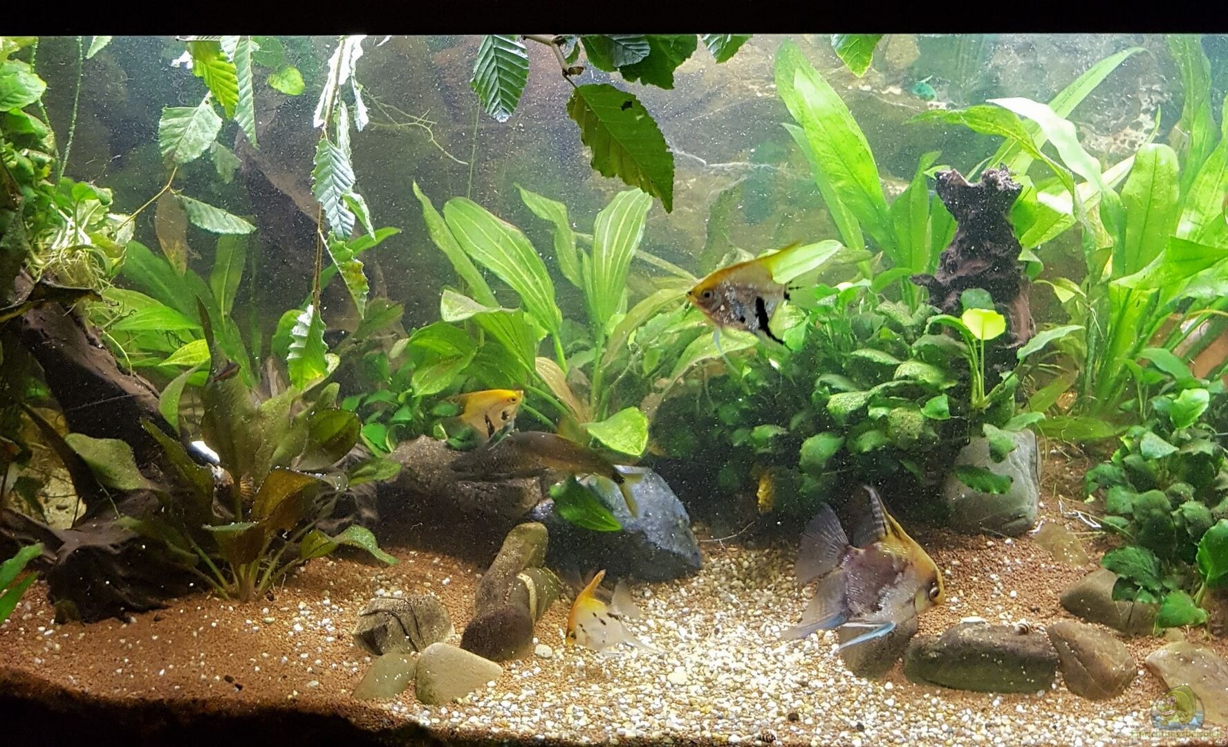 < 5 Pterophyllum Skalare < 3 Chrossocheilus reticulatus (Netzpinselalgenfresser) < 10 Otocinclus hoppei (Ohrgitter-Harnischwels) < 8 Corydoras aeneus (Metallpanzerwelse) < 3 Peckoltia vittata (Zierbinden-Zwergschilderwels) > 2 Pimelodus pictus (Engelswels) < Anentome helena (Raubturmdeckelschnecken) < Vittiana Coromandeliana (Zebrarennschnecken)