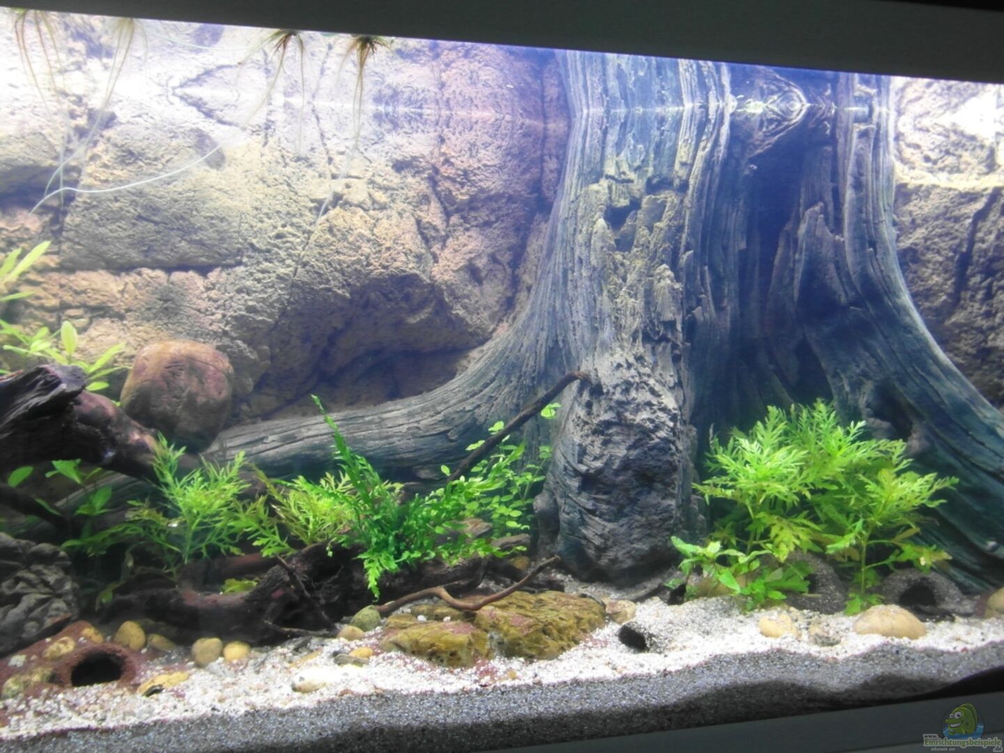 Hinterschwimm, kriech- und krabbelbare Rückwand, welche an den unteren und seitlichen Kanten nur punktuell mit JBL Haru verklebt wurde. Das Wasser kann somit u.a. durch die entstandenen "Verklebelücken" zirkulieren. Darüber hinaus ist der hintere Bereich der Rückwand durch einen 7 x 5 cm gro??en Durchgang zugänglich, welcher sich im linken unteren Bereich befindet. Auch hier gelangt Wasser hinter die Rückwand um einem Stillstand des Wassers entgegen zu wirken.