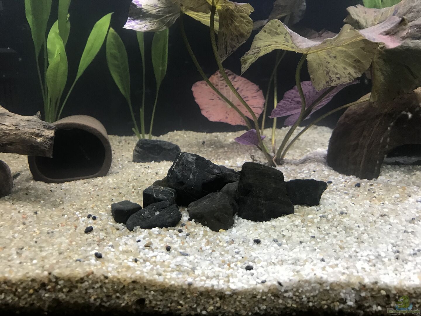 * 2 Moorkienwurzeln * 1 Tonhöhle für die Synodontis lucipinnis * 1 Kokosnusshöhle für die Pelvicachromis taeniatus * einige mittlere Kieselsteine aus der Ostsee (wurden am 18.11.24 entfernt und durch drei mittlere Grauwackensteine ersetzt). * drei mittelgroße Grauwackensteine * einige kleine schwarze Kieselsteine in größeren Gruppen am Boden * die Seitenwände und die Rückwand sind mit schwarzer Folie beklebt * einige Erlenzapfen * Buchen/Eichenblätter/Seemandelbaum [...]