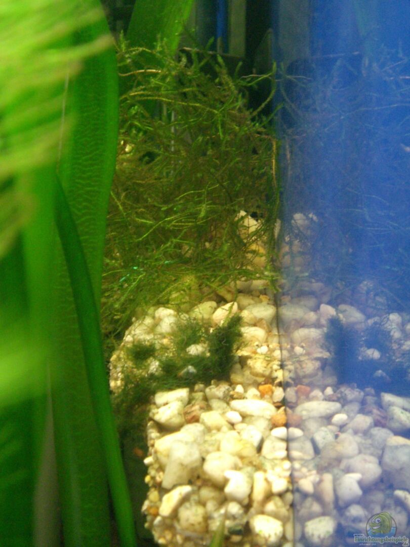 Im hintergrund: Riesenvallisnerie (Vallisneria gigantea), In der Mitte: breitblättrige Amazonasschwertpflanze, Hemigraphis repanda, (glaube das sie es ist), Vallisneria nana. Die von mir eingebauten Terassen sind mit Javamoos und Anubia Nana bepflanzt. An einer der kleinen Wurzeln habe ich Sü??wassertang befestigt, die ist mittlerweile komplett überzogen damit. Im Vordergrund: Anubia Nana. Dünger: Düngesystem von Dennerle: A1 Daily NPK, V30 Complete, [...]