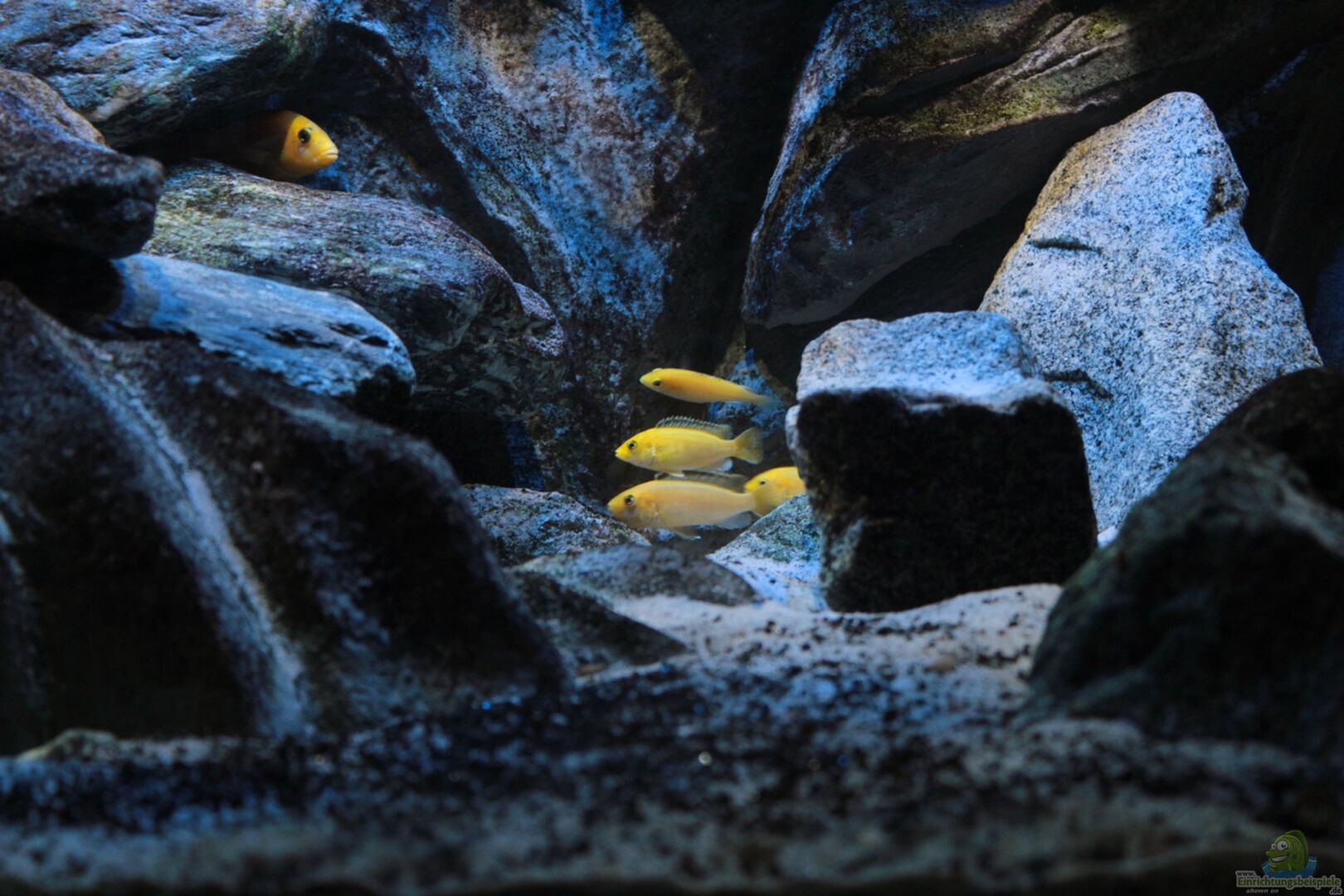 Selbstgebaute und zum Teil hinterschwimmbare Rückwand. Ziel war es, eine Rückwand zu gestalten die ziemlich Naturnah ist, und den Ansprüchen der Fische entspricht. Als Motiv diente ein gemachter Ausschit aus dem Video "Fastzination Malawiesee". Diese war wirklich nicht einfach zu gestalten, aber unterm Strich denke ich, dass es uns einigerma??en gut gelungen ist. Bisher hat sich aber noch keiner beschwert. ;-) Steine (aus dem Baumarkt) etwa 20KG
